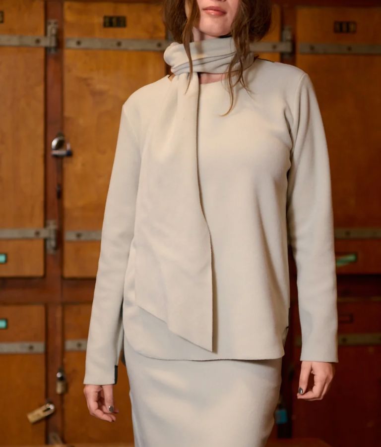 A fleece blouse featuring a round neckline, long sleeves, and a matching scarf, designed with a rounded hem and a slightly longer back to create a flattering silhouette. This feminine blouse is comfortable and easy to style with your favorite jeans or a skirt.