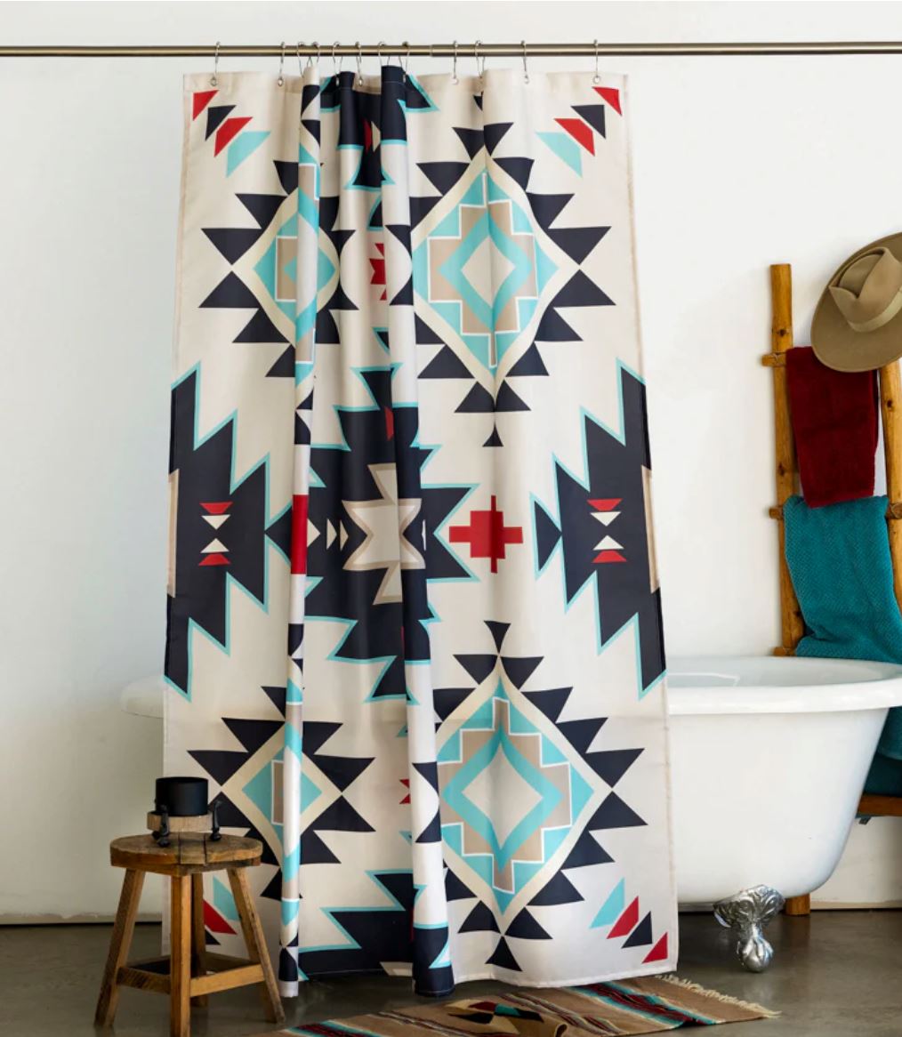 *100% polyester fabric - machine washable. Iron on polyester setting. Comes with set of silver shower rings.  Size - 70” x 70.5”.