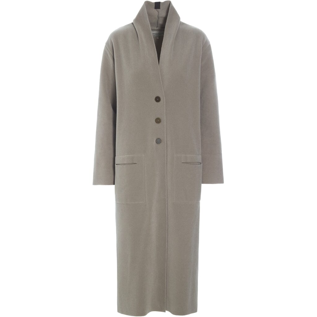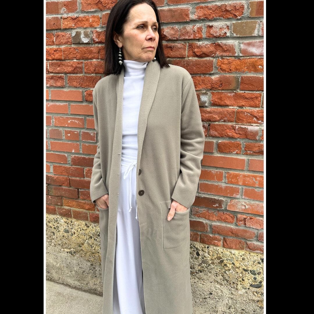 Long cardigan with large collar, pockets, and three brass buttons down the front.