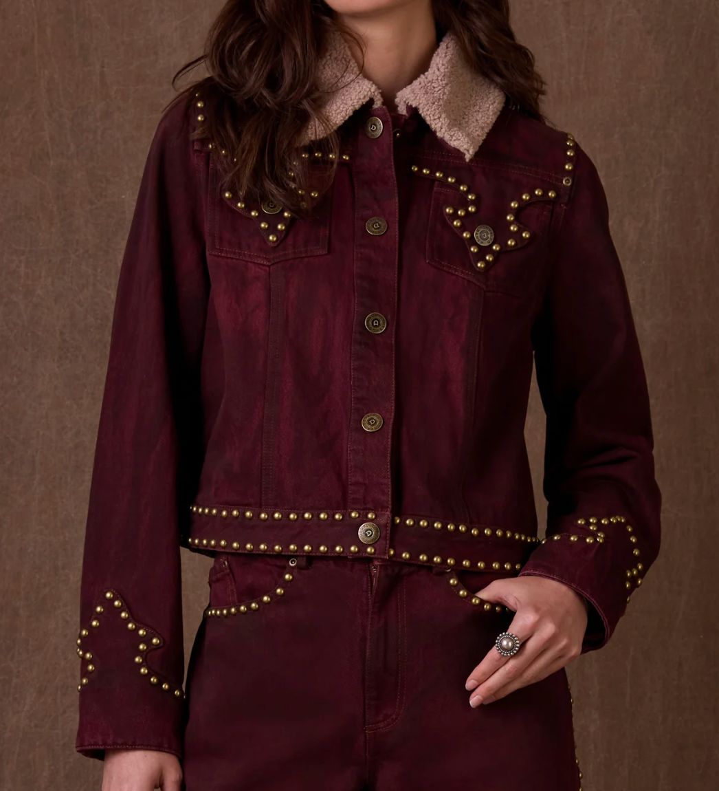 This jacket is one of those pieces that’s surprisingly versatile but totally unforgettable. The silhouette is that of a classic denim jacket, but the rich oxblood hue brings it to life in an unexpected way, complemented by dramatic pocket flaps, bold brass studding, and a luxe sherpa collar. You can rock it over almost anything or pair it with the Path to Ponderosa Pant – an all-around win for your wardrobe!
