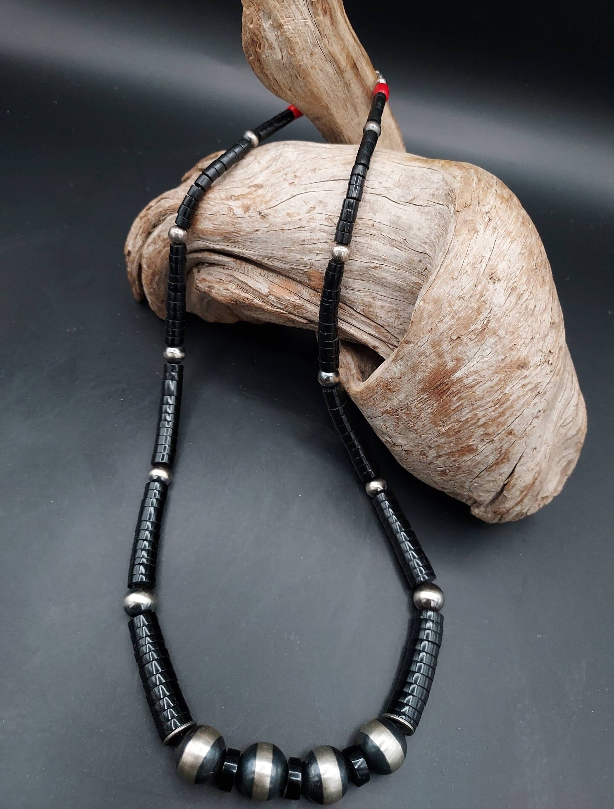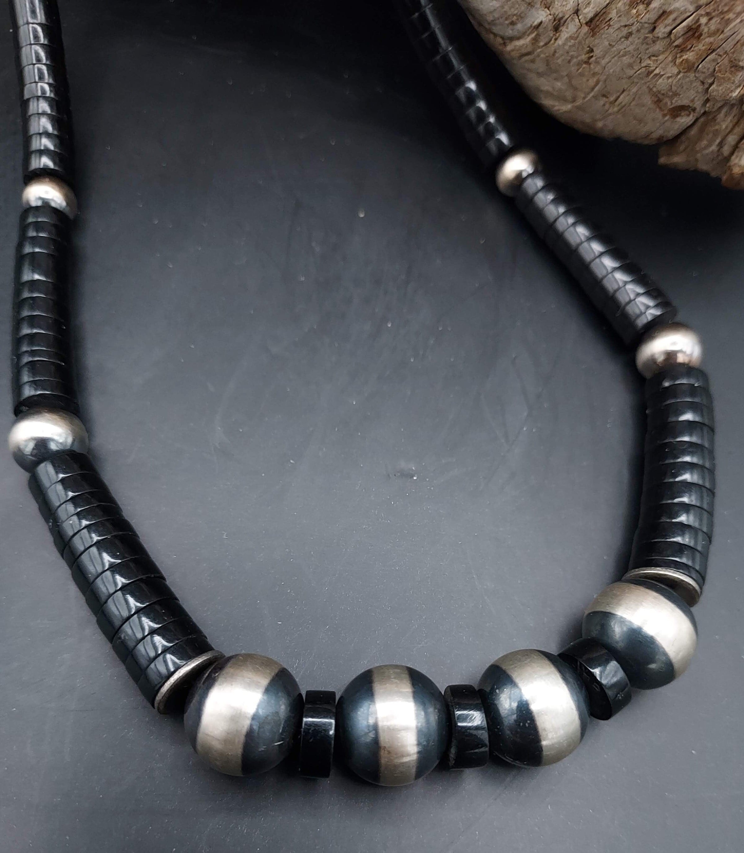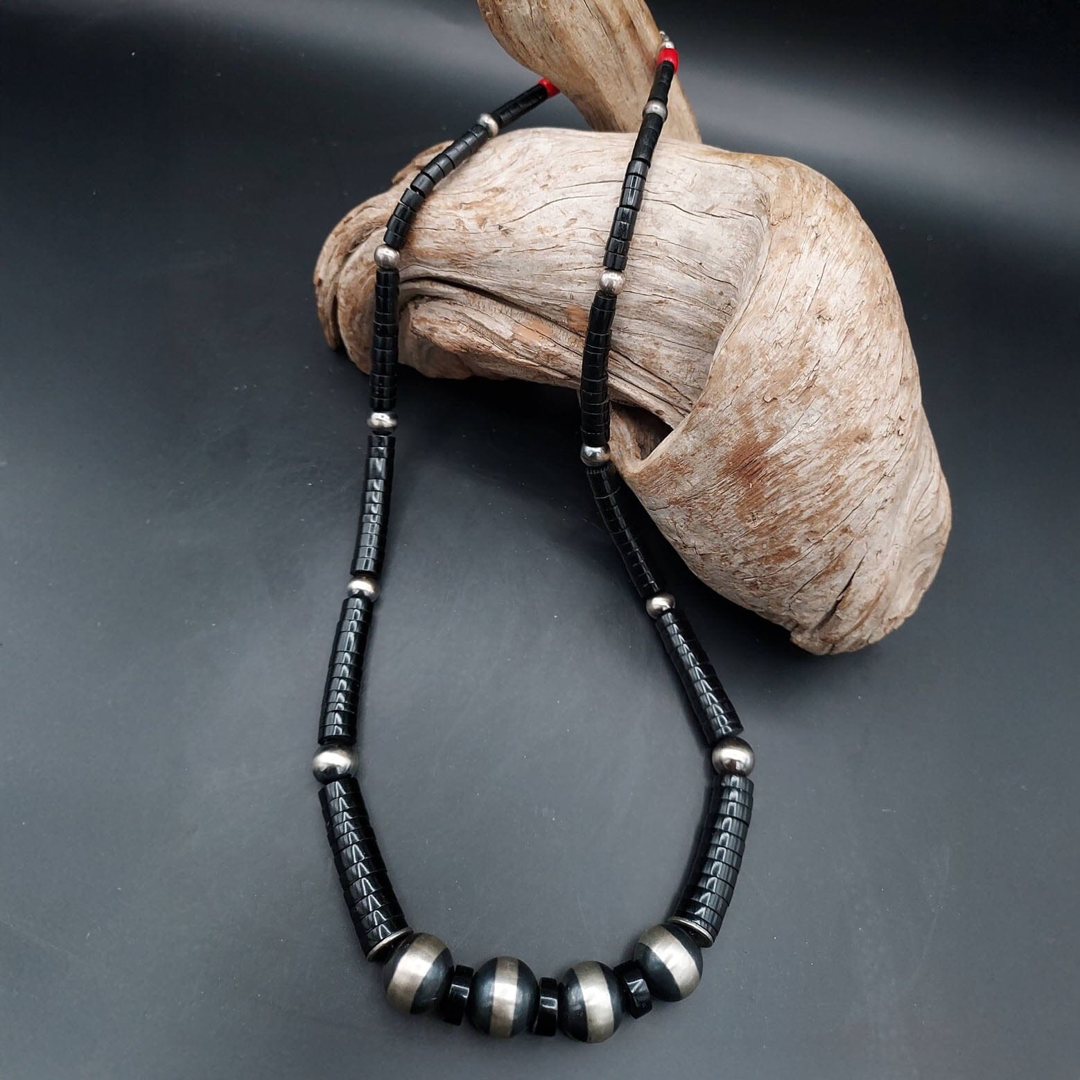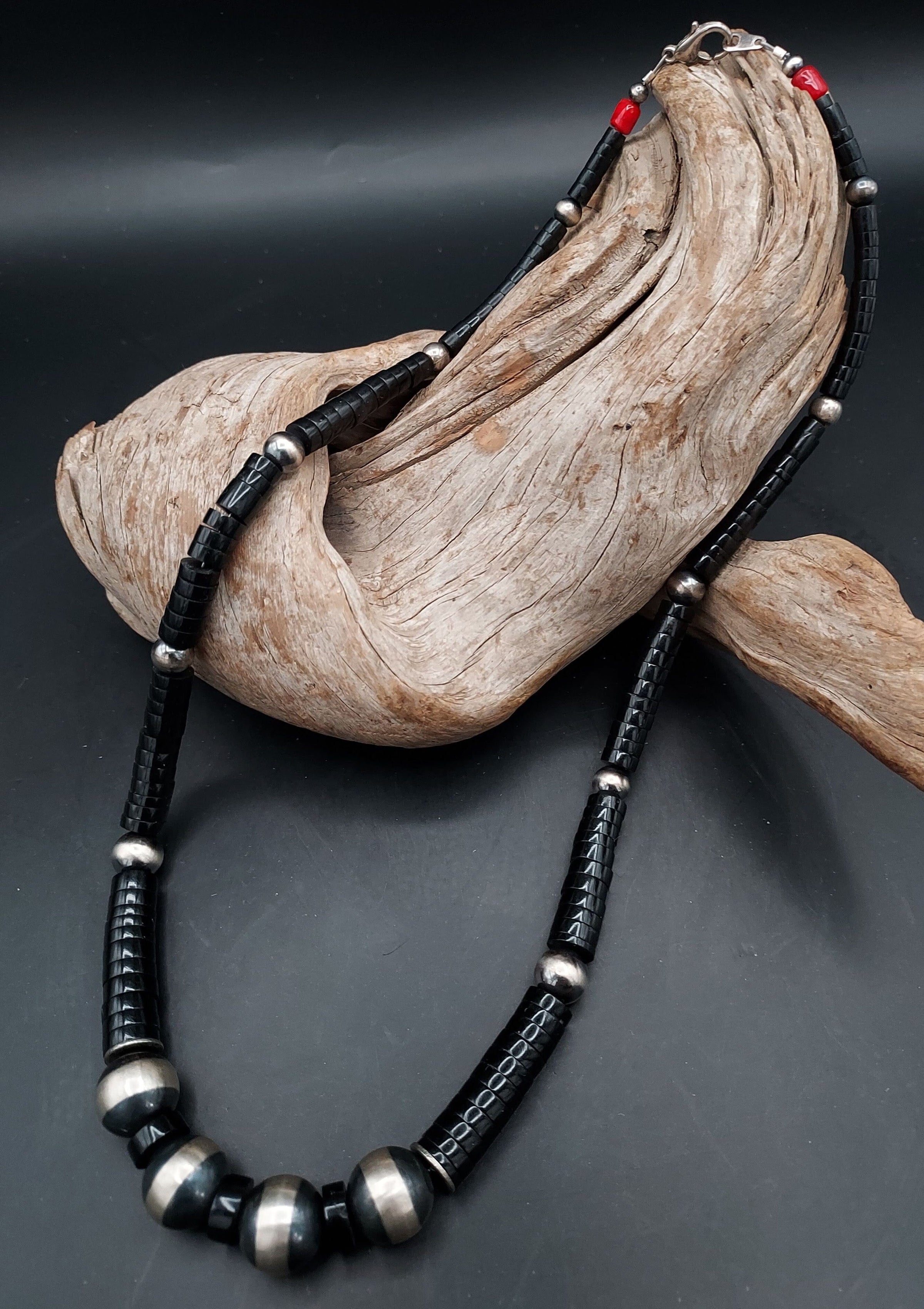 This striking handcrafted necklace features a single strand of Jet, Coral, and Navajo Pearl-style beads. The flat disc Jet beads range in size from 10mm down to 4mm, giving the strand beautiful texture and dimension.