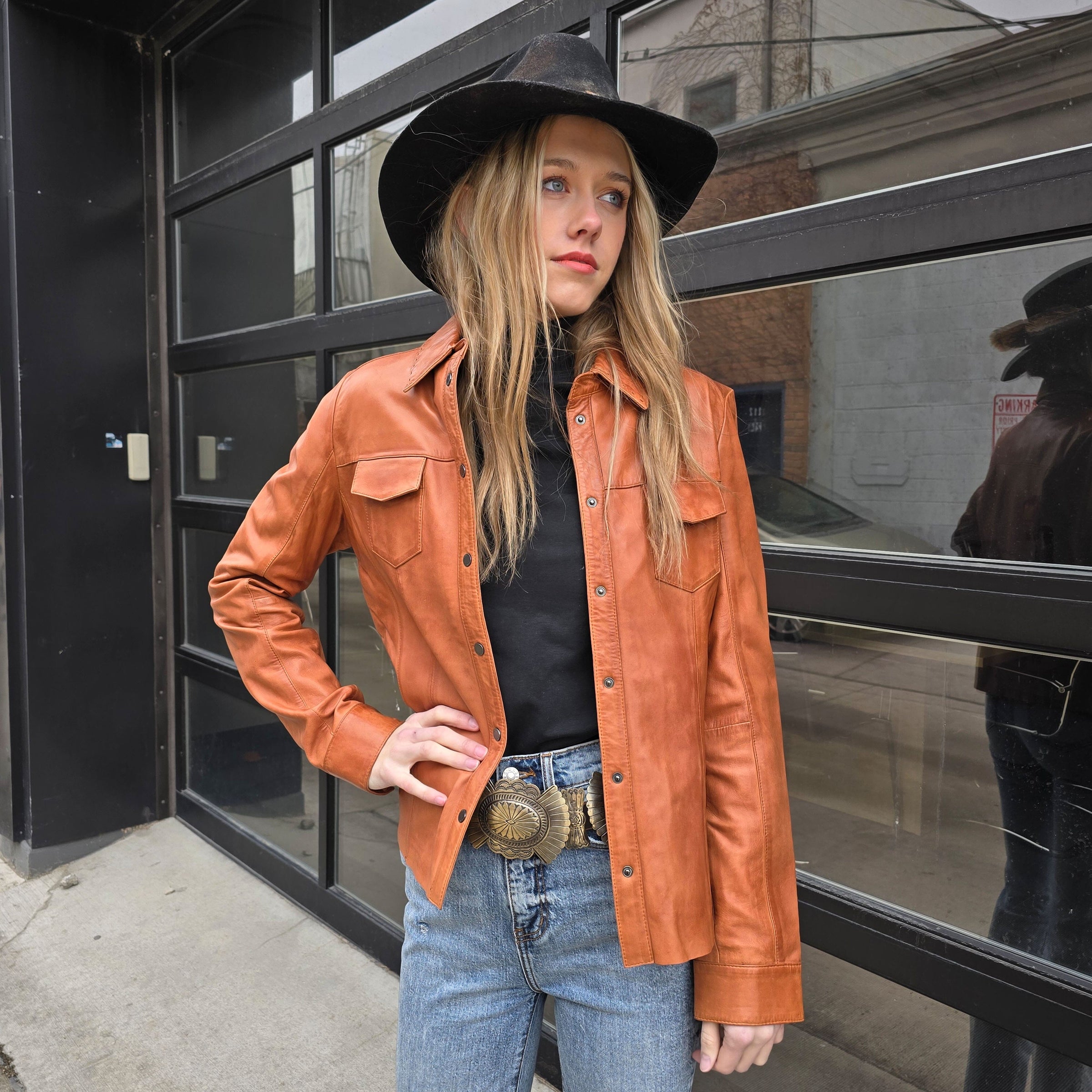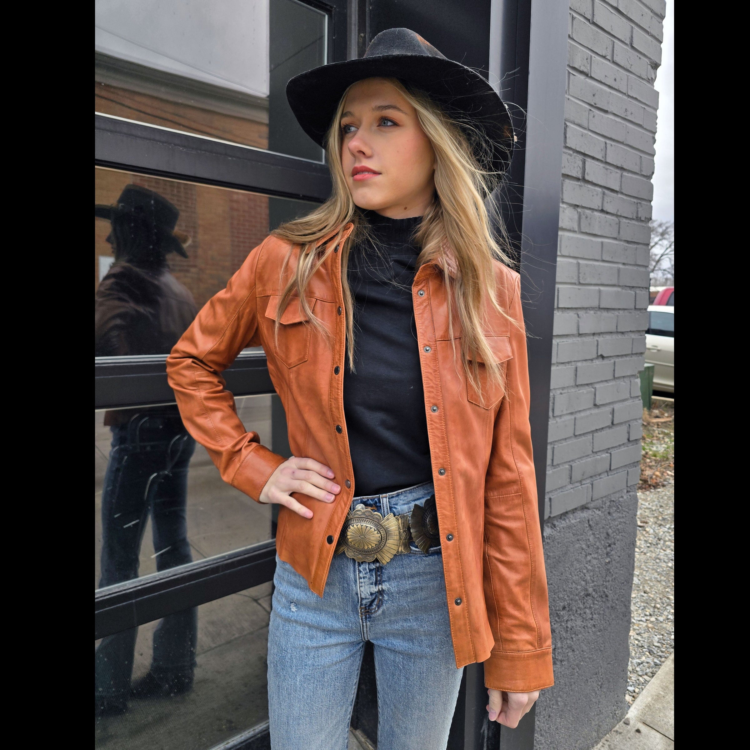 Ladies leather shirt style jacket. Made from lamb leather, this jacket is soft, durable & designed to age beautifully with time. Featuring a pointed shirt-style collar with decorative stitching, this jacket blends casual and stylish elements. Equipped with a sturdy snap-button closure for easy wear & snap cuffs, this jacket offers both style and convenience. Two chest flap pockets with snap-button closures provide practical storage space, perfect for small essentials. Designed with vertical stitching along the body to create a flattering, structured silhouette that complements the natural curves of the body. The interior is lined with a soft polyester for added comfort. The jacket is perfect for various occasions.