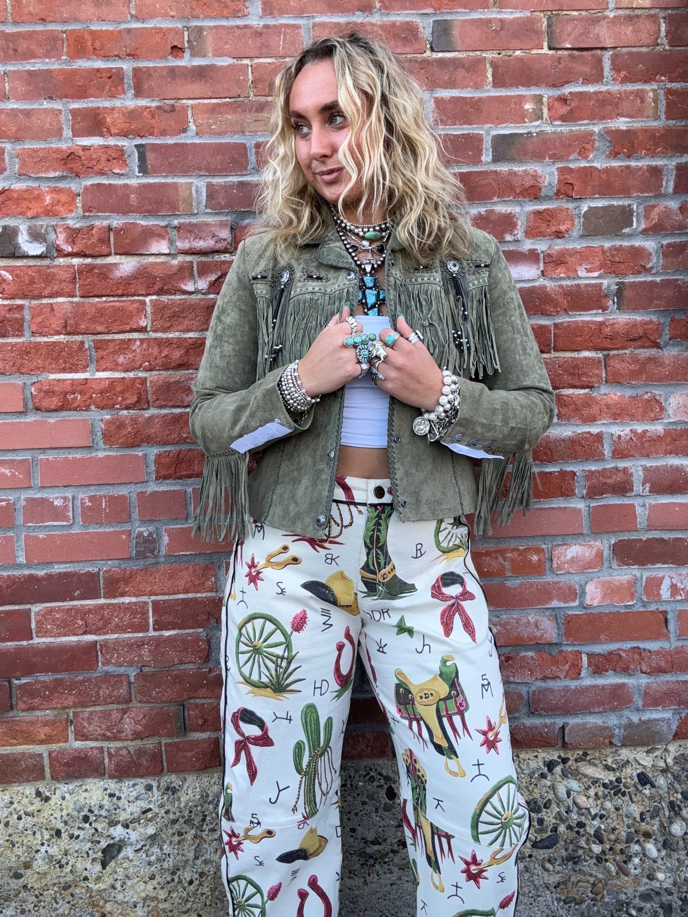 Fringe and beaded jacket. This classic western jacket has a flattering fit. It features fringe yokes front and back and down the sleeves. This western design features conchos with beaded fringe and stud and bead design detail. Lined.