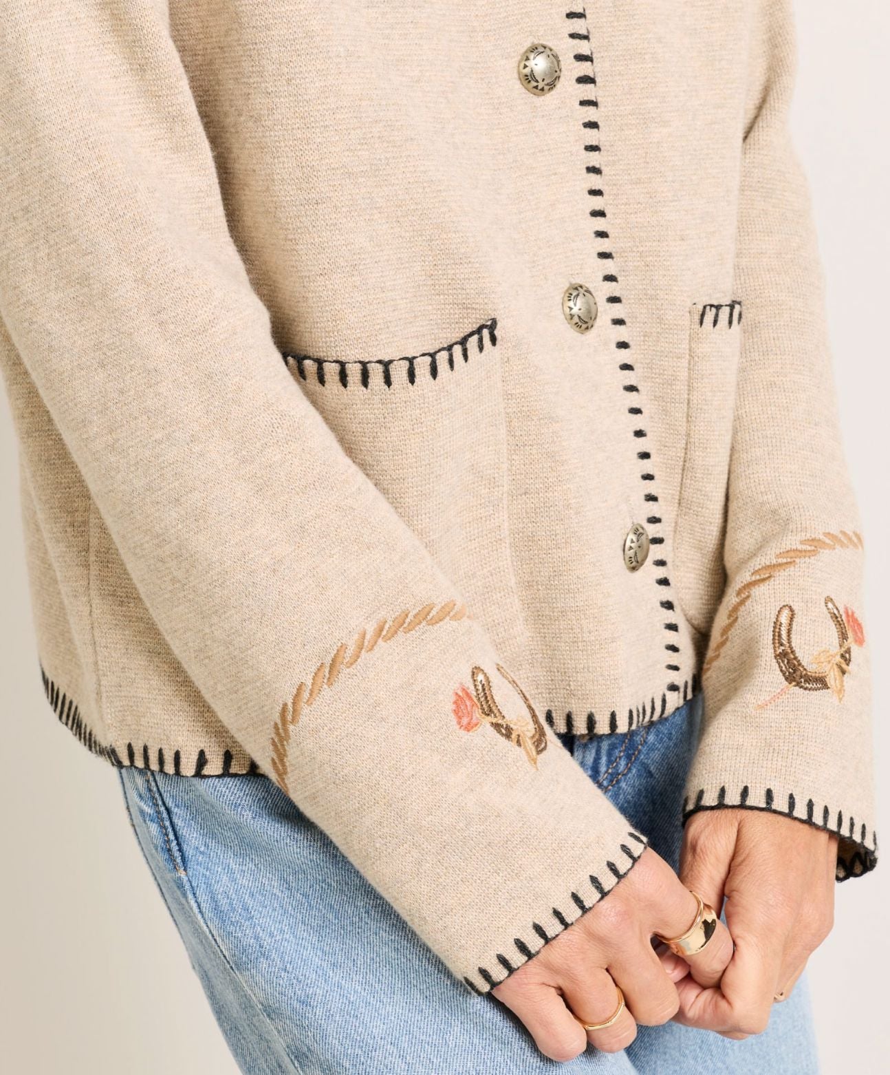 Celebrate the spirit of the West in our bestselling souvenir cardigan, crafted in a soft, breathable cotton-merino blend. Western-inspired motifs span the front and sleeves, showcasing Pendleton's artistry in every detail. Nickel silver novelty buttons and whipstitch accents add handcrafted charm, while a relaxed fit and two front patch pockets keep it wearable and versatile.