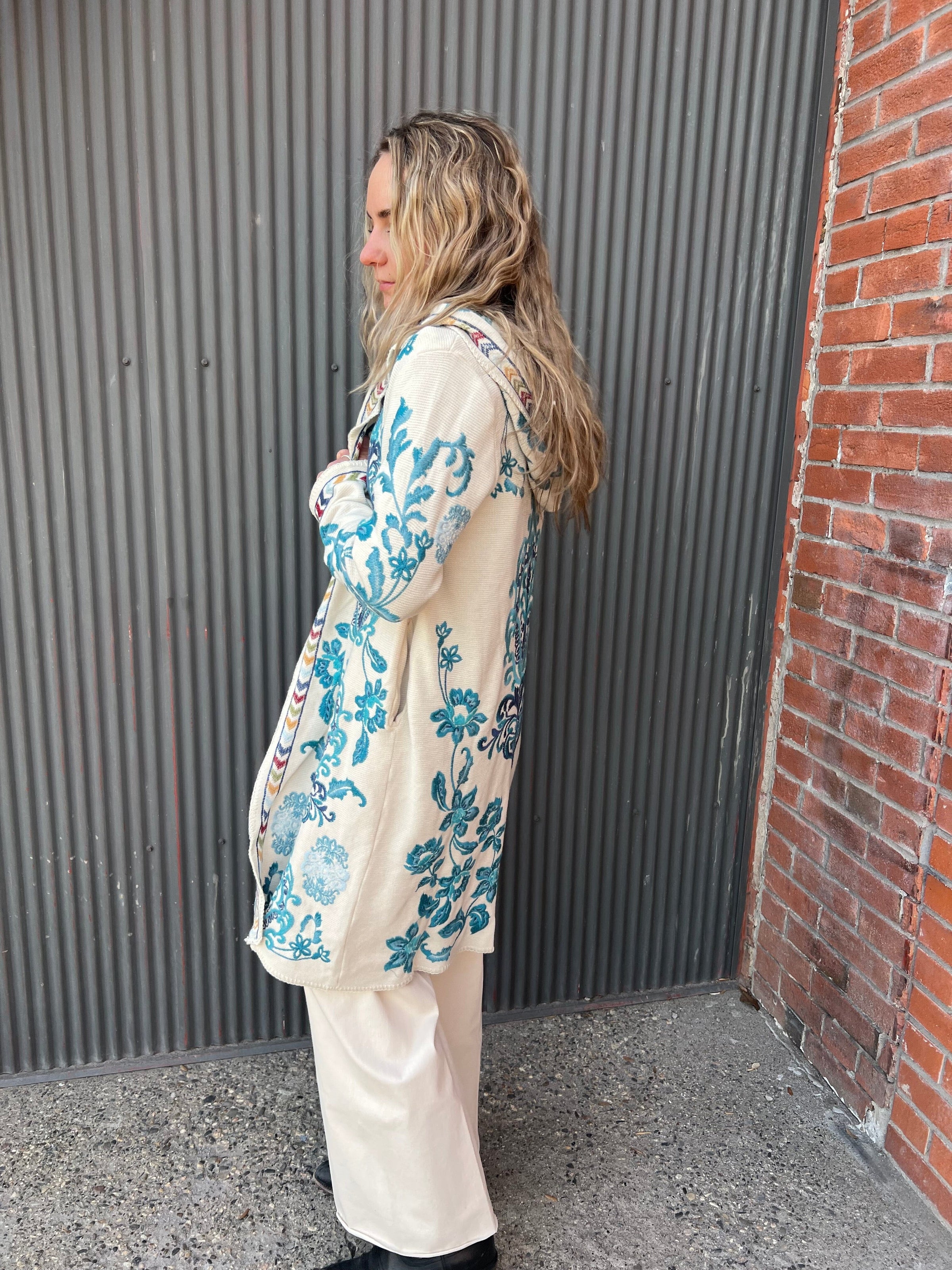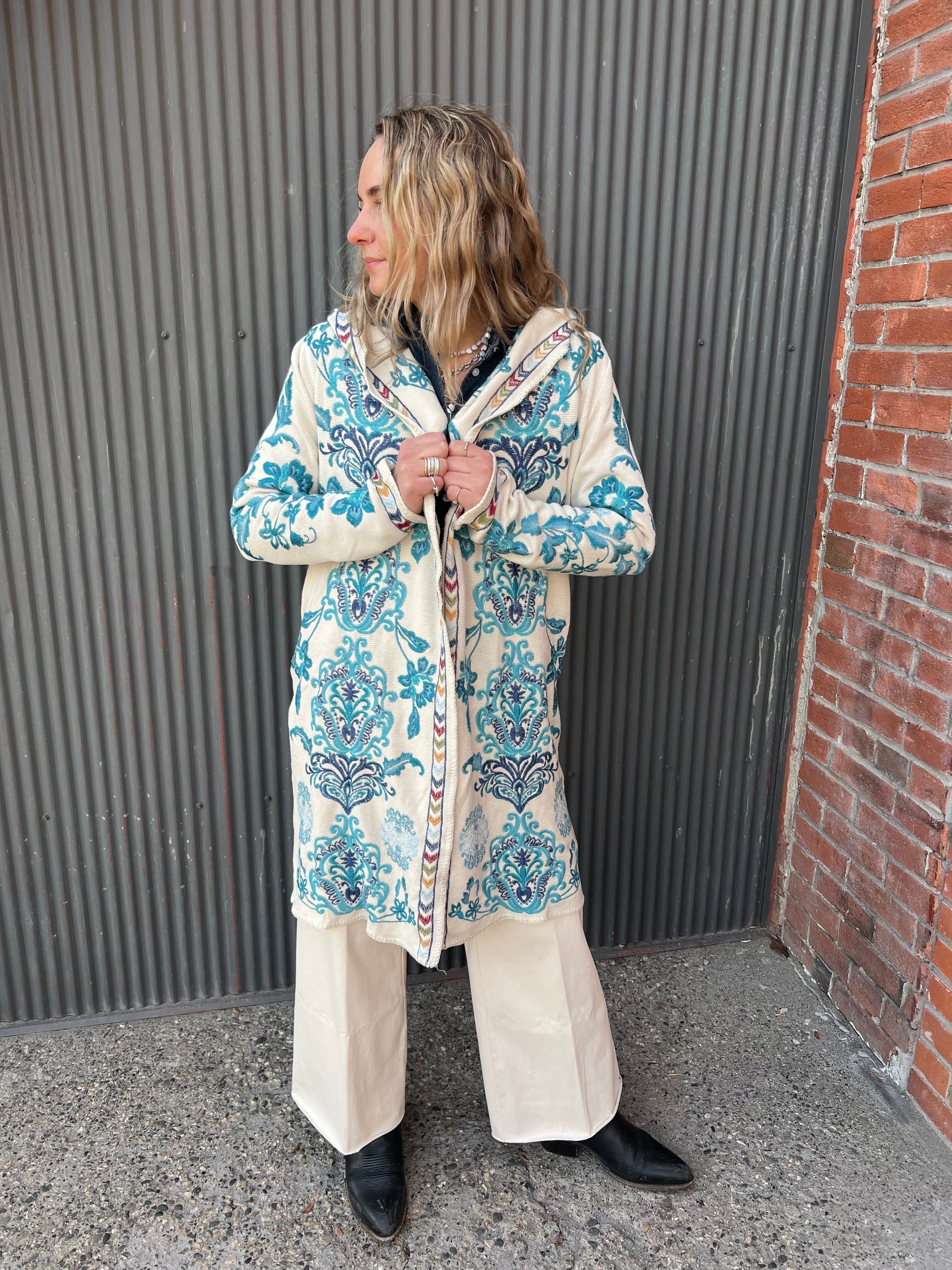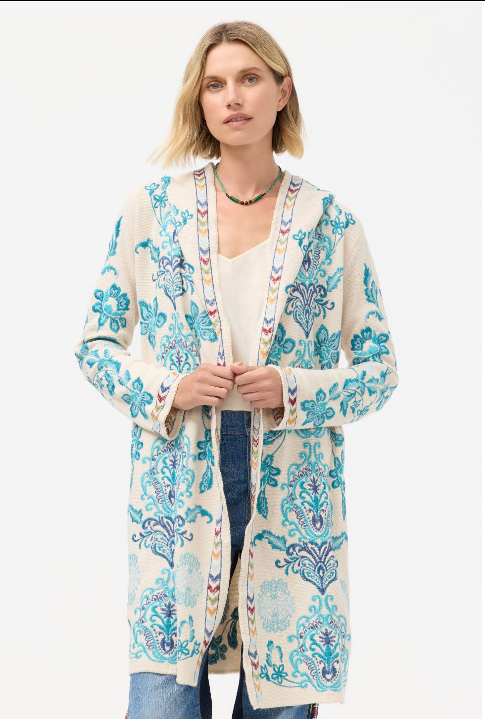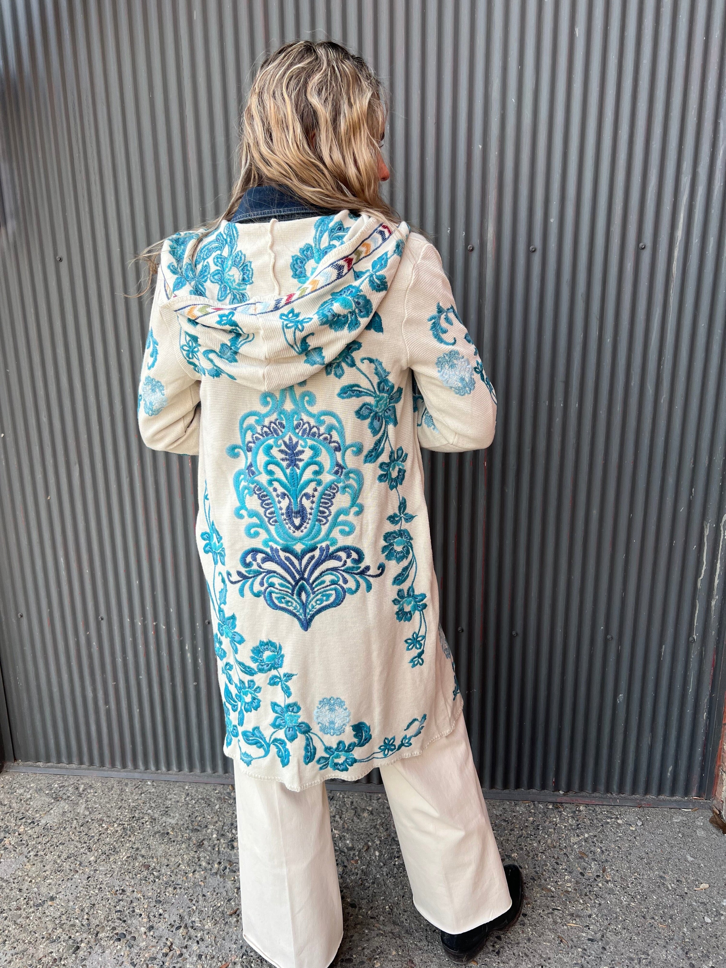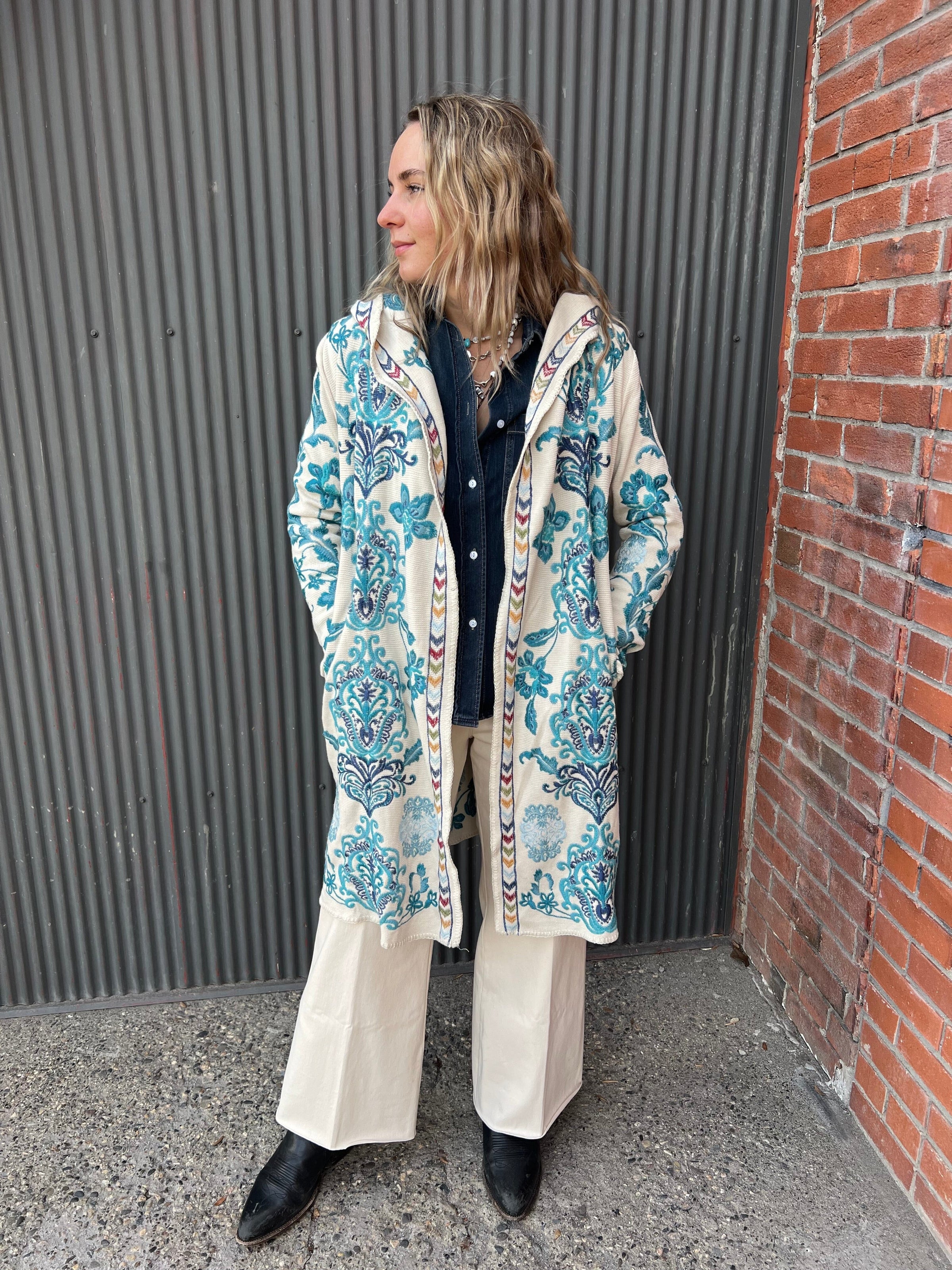 Beautifully embellished with icy blue embroidered detailing, the Vittoria Biya Duster is an eye-catching layering piece. Featuring an open front and attached hoof, this cozy duster is finished with pockets at the sides. Layer over a coordinating blouse and pair with relaxed denim for a polished casual look perfect for a night out with friends.