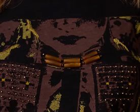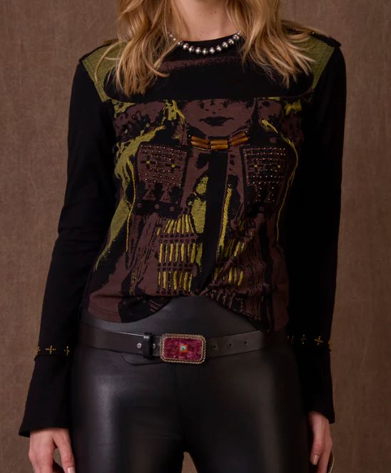 This eye-catching top features shadowy silhouettes and is brought to life beautifully in rich hues on a bold black background, finished with exquisite embellishments of beaded details and hairpipe accents.