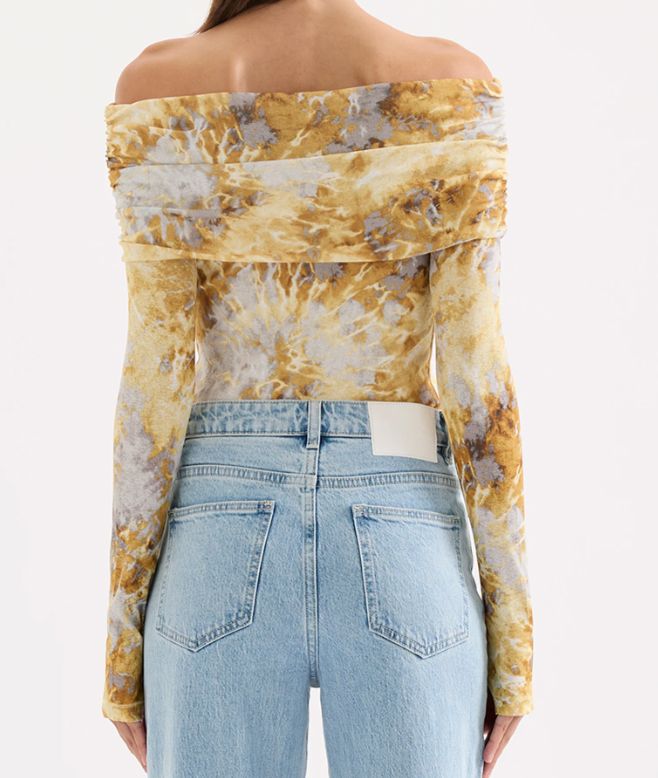 The Dalton Mesh LS Top is made from a stretch jersey in our exclusive Lumine print. Silhouette is a flattering close fit with full length sleeves and length finishing at the hip. Features include a foldover off shoulder neckline and thumbholes.100% Polyester