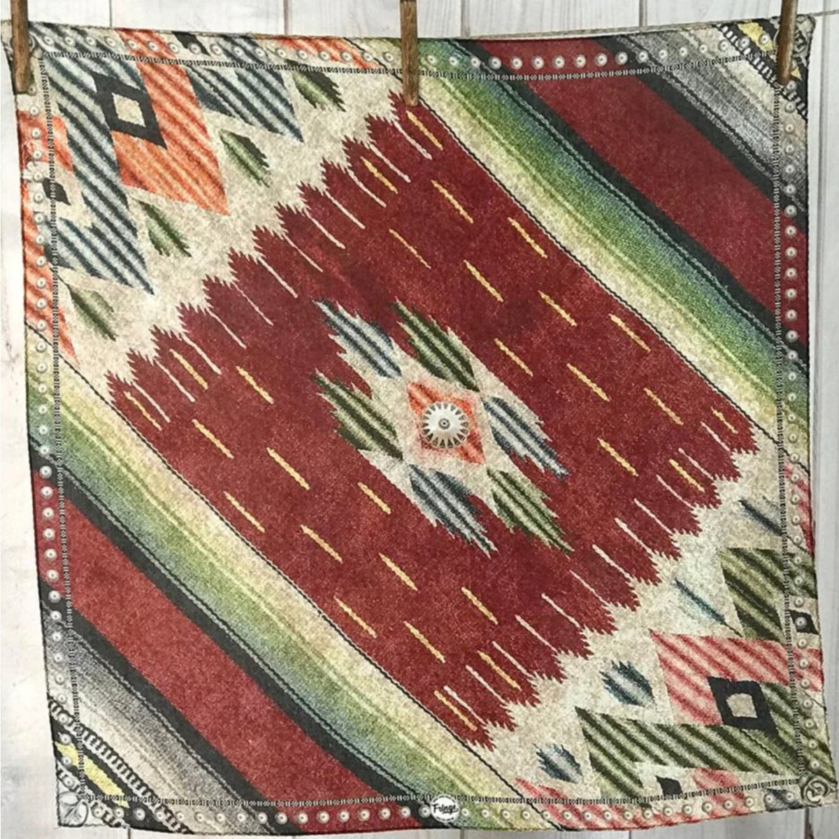 This one has a big story behind it! My mom had a mare that she road to school every day. She was one of her all-time favorites for ranching and dragging calves to the fire. Her name? .... Topsy! The print used for this scarf was a Mexican saddle blanket my grandmother Ollie brought back from Mexico in the 50's, she gave it to my mom and she used it for years, mostly on her favorite mare.