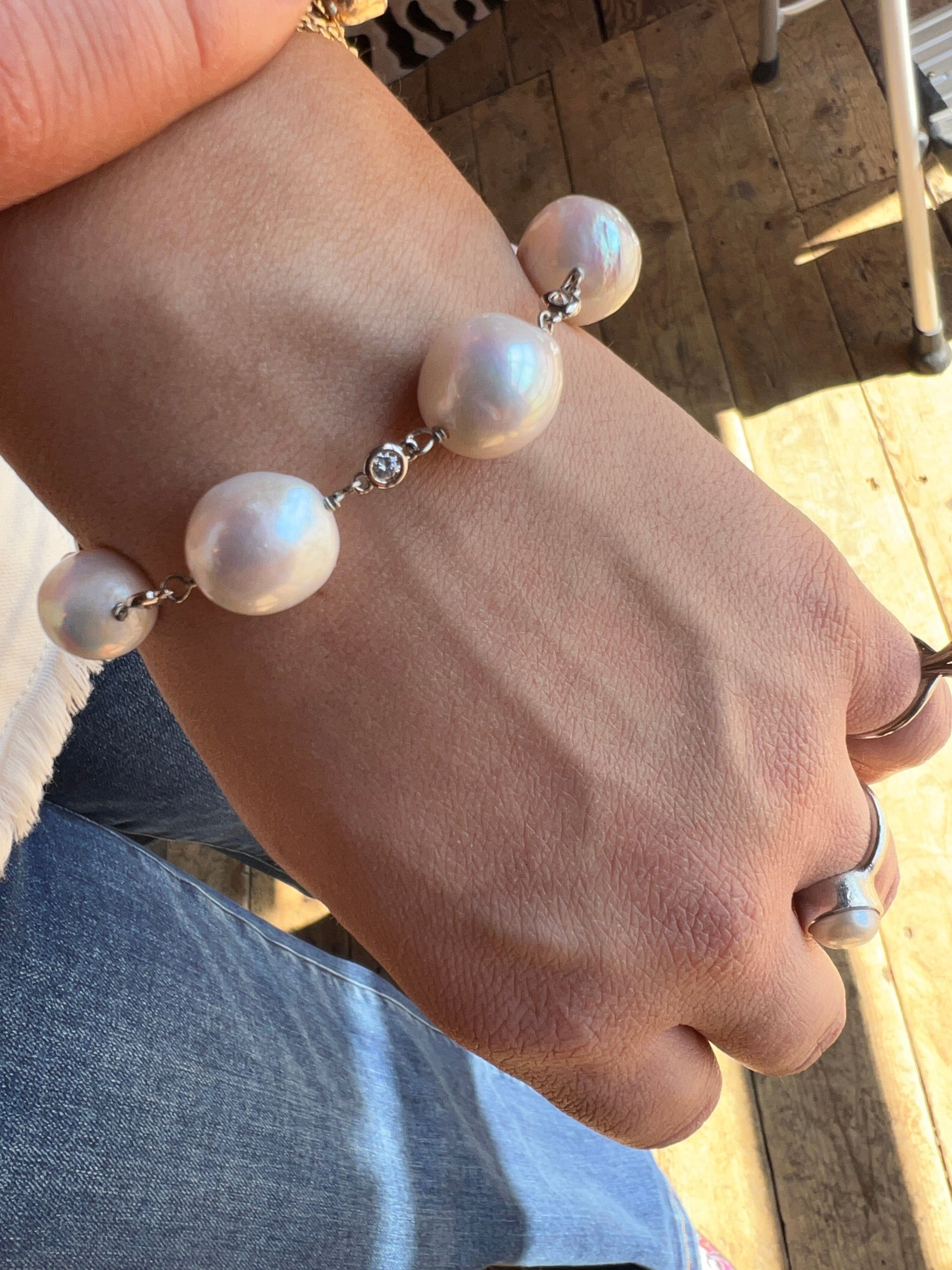 Luminous White Freshwater Cultured Edison Pearls & Bezel Set Austrian Crystals on Gold Plated Sterling Chain Bracelet w/ Gold Plated Hammered Toggle Clasp 7.5”.