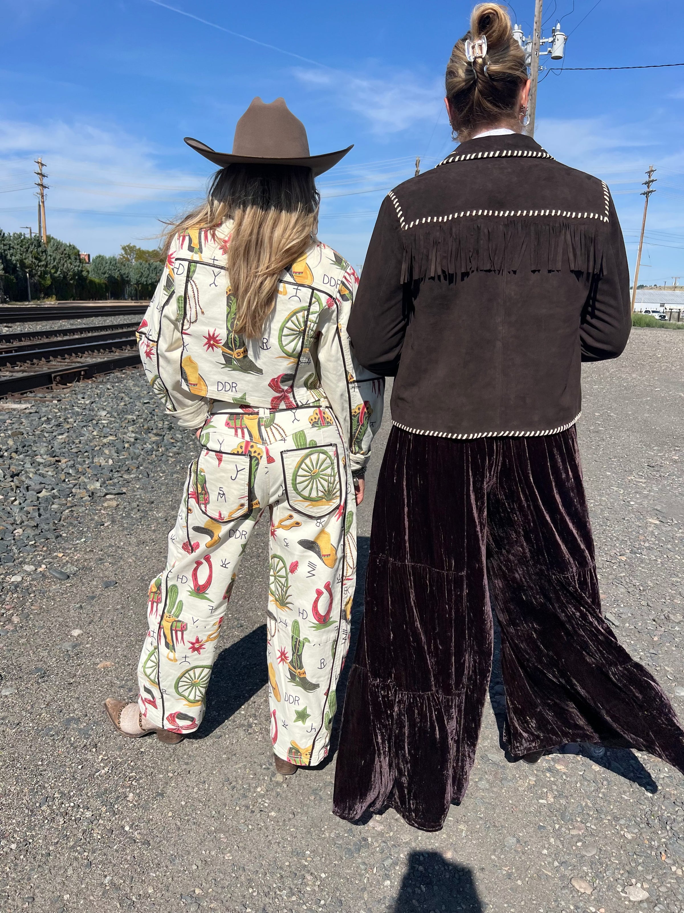 This statement jacket is everything there is to love about Atomic Ranch. We brought it to life in the season’s signature color, ‘bronco’ brown (just a few shades shy of black), in a gorgeous goat suede, trimmed with a charming contrast whipstitch. It’s embellished with awesome embroidery of a couple colorful cowboys and inlay retro red boomerang welts.