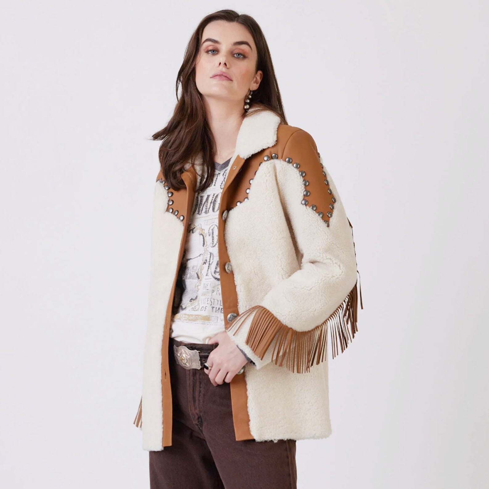 Shearling is showing up strong this season, and this cozy-couture coat brings it to life beautifully in a cool, classic way. In kind of a cowgirl spin on color-blocking, it balances the biscuit-hued soft shearling with supple brown suede shoulders, trim, and fringe. It’s finished with custom concho buttons and a complementing sash – but we encourage you to cinch it with a classic concho or a vintage leather belt, too!