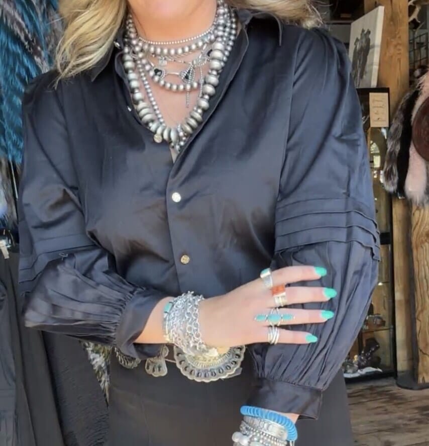The classic Oxford shirt is our essential piece for our Core Collection. Our fun and edgy twist on a classic button-up style features a pleated balloon sleeve detail and signature gold buttons. Cotton Poplin fabric in classic black.