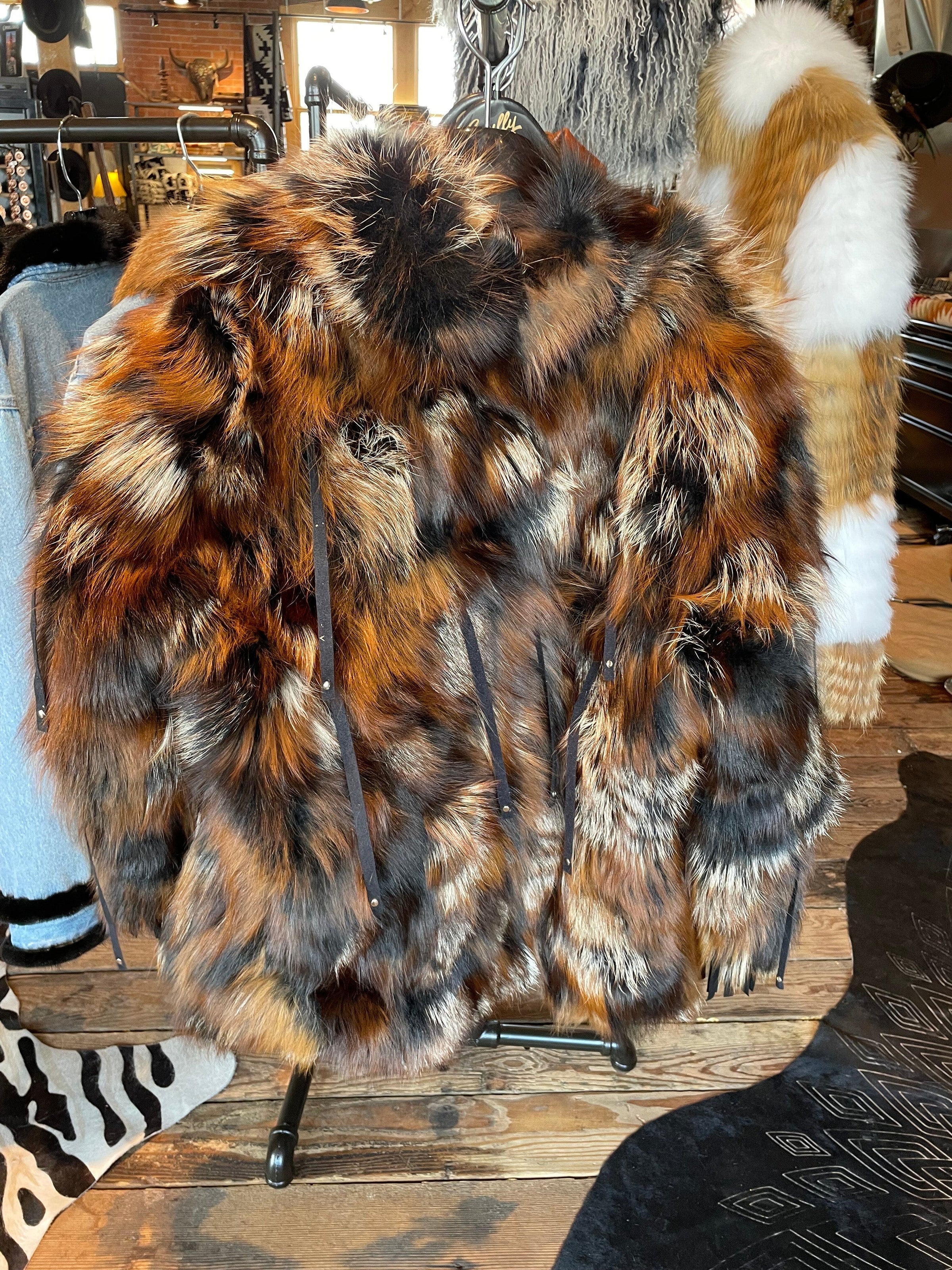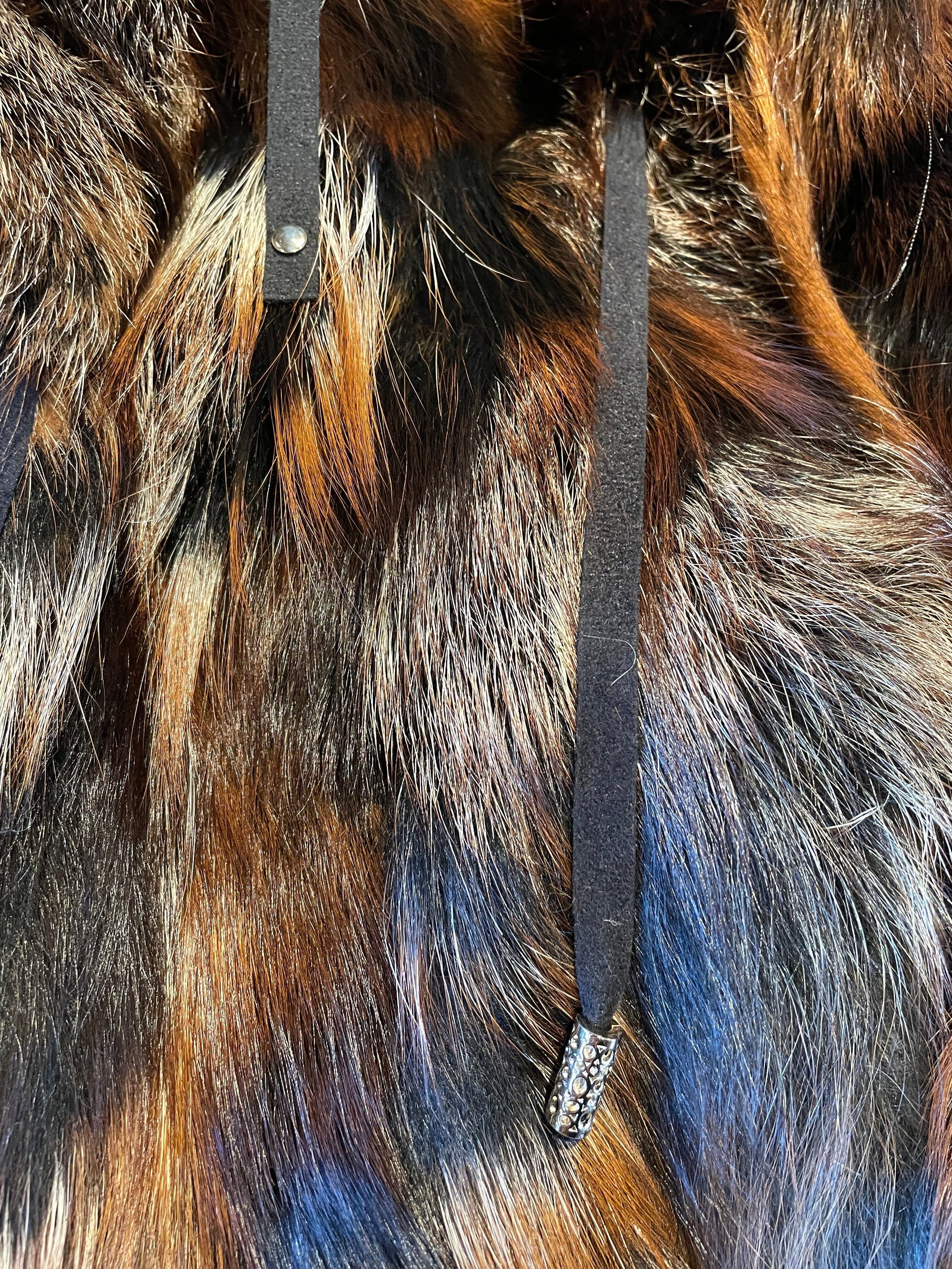 Variegated black, brown & cream tones of fox fur. Features fringe details