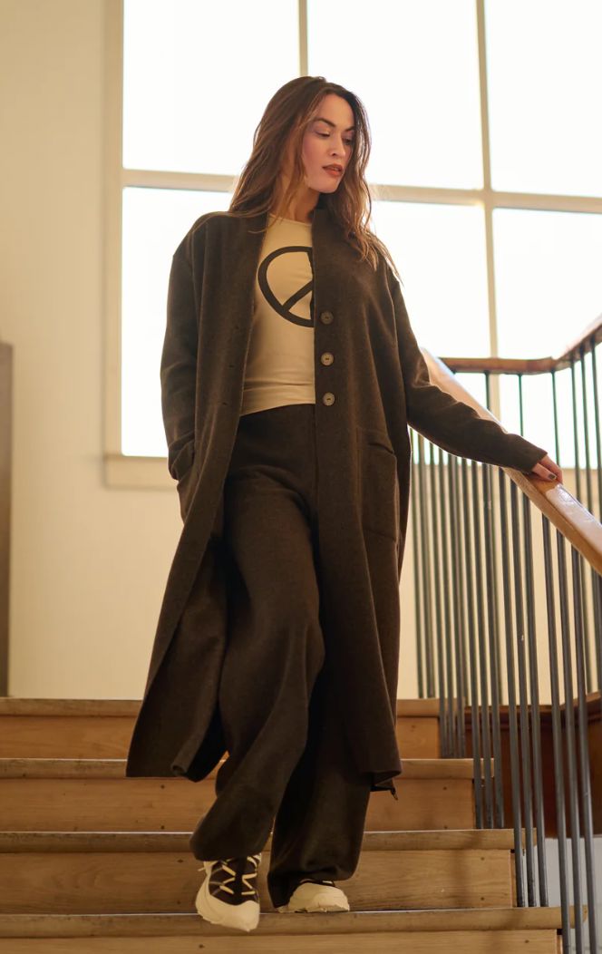 Long cardigan with large collar, pockets, and three brass buttons down the front.