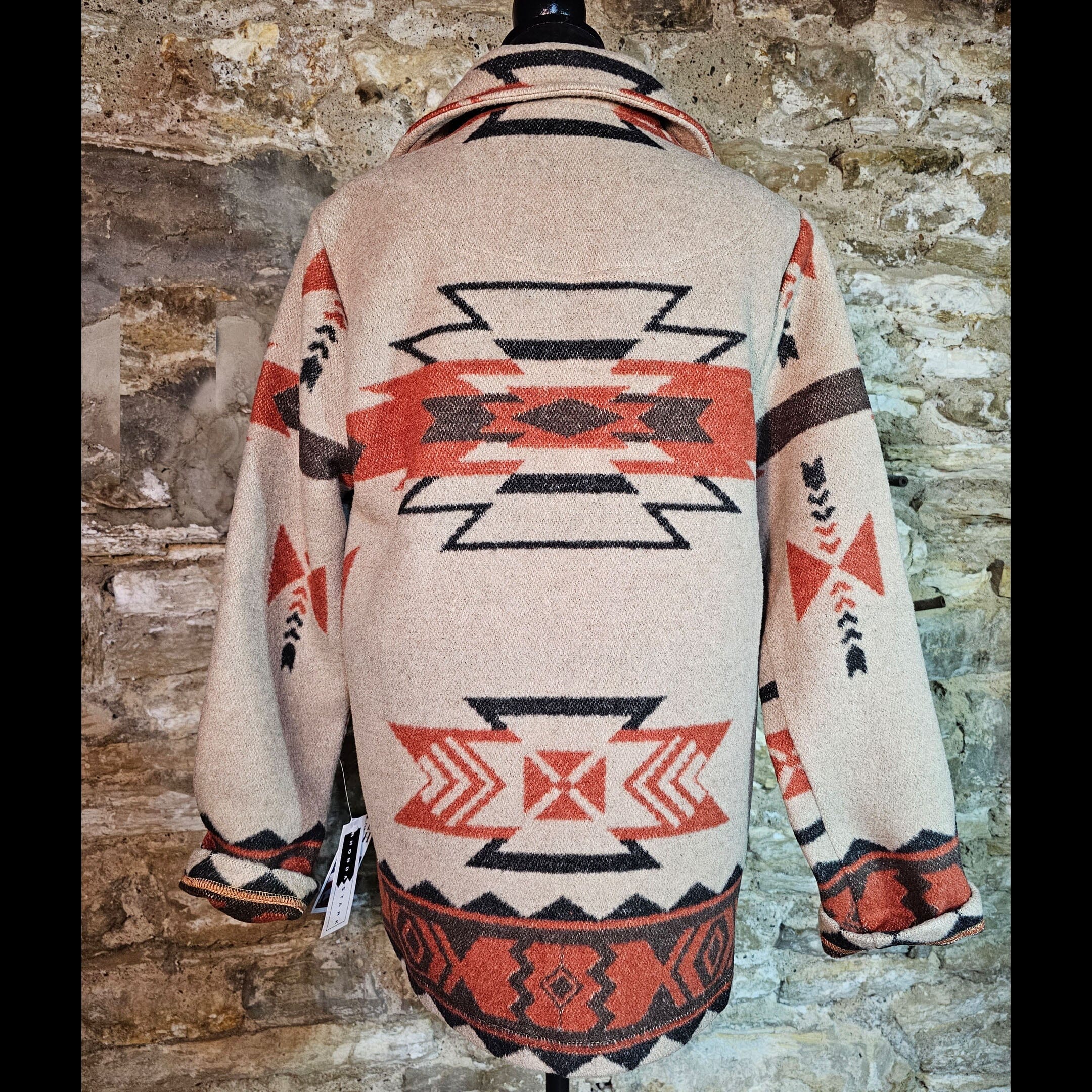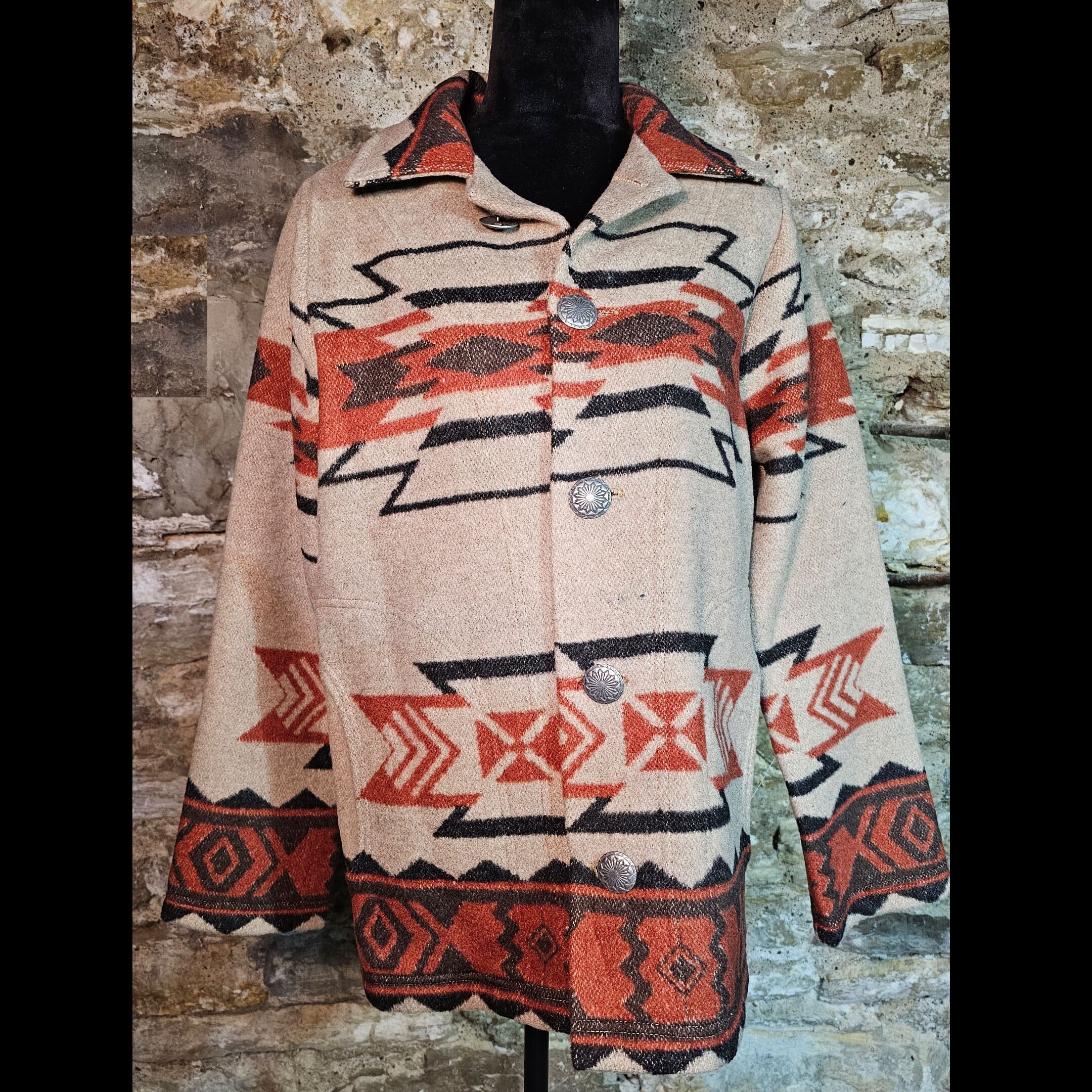 Spice Chip is a wool blend fabric with side-entry pockets, a square collar & concho button closure (unlined). MADE IN THE USA!