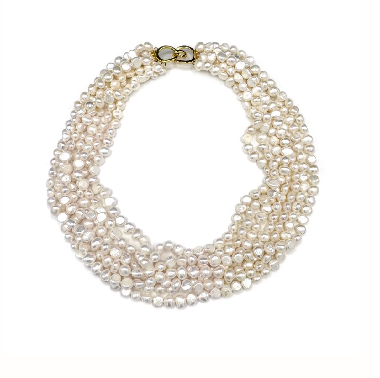 White Freshwater Cultured 7-Strand Keshi Pearl Necklace Double-Knotted on Silk w/ Gold Plated Stainless Safety Clasp. 19".