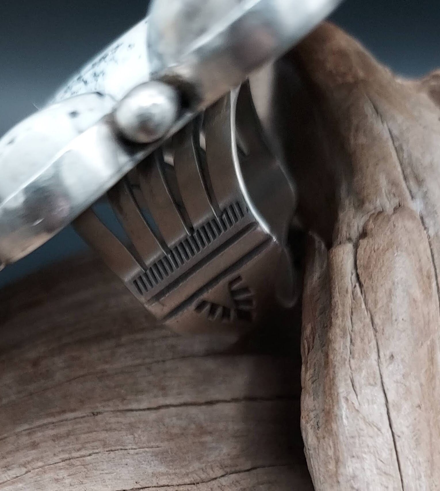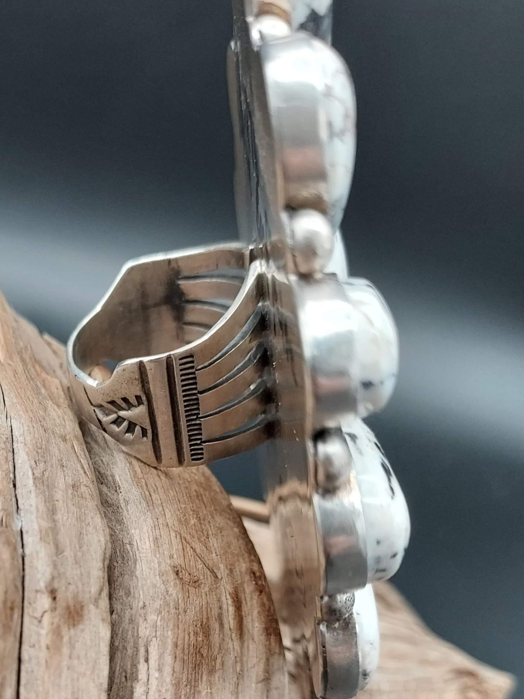 A breathtaking collectible statement ring featuring 13 genuine White Buffalo stones in a bold cluster design. Twelve teardrop-shaped stones encircle a striking large oval center stone, all set in a beautifully crafted sterling silver setting. This is a powerful, heirloom-quality piece—perfect for serious collectors and lovers of rare White Buffalo.
