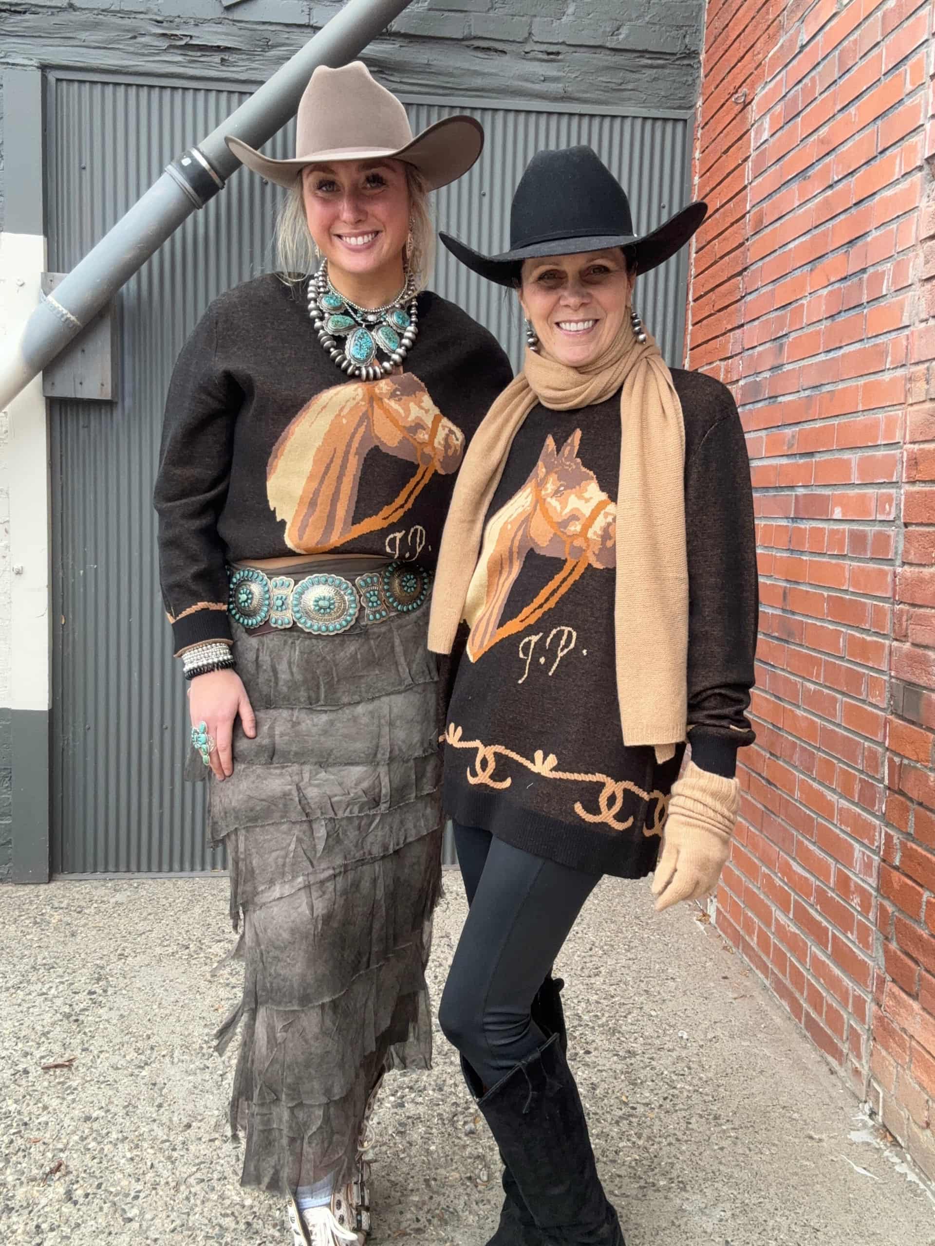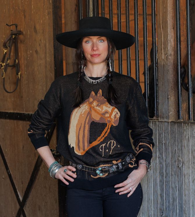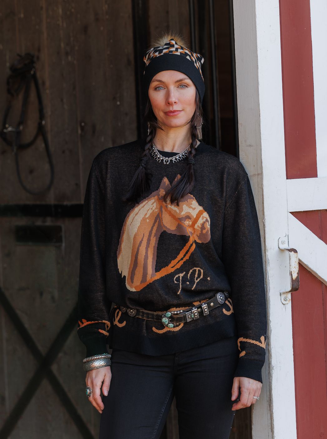 The Ariana Sweater by Tasha Polizzi is a luxuriously soft black knit featuring an artistic horse motif and custom initials. Crafted from 100% cotton, this long-sleeve design offers a comfortable fit with an extended length for effortless coverage and timeless Western style.