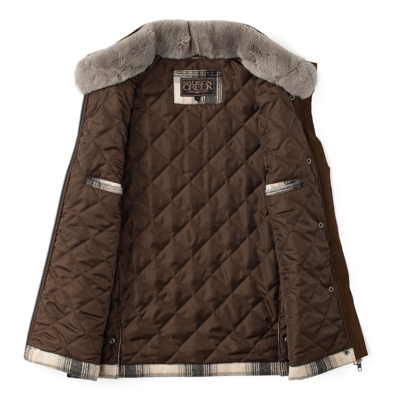 - Detachable genuine rabbit fur collar with interior button-loop attachment