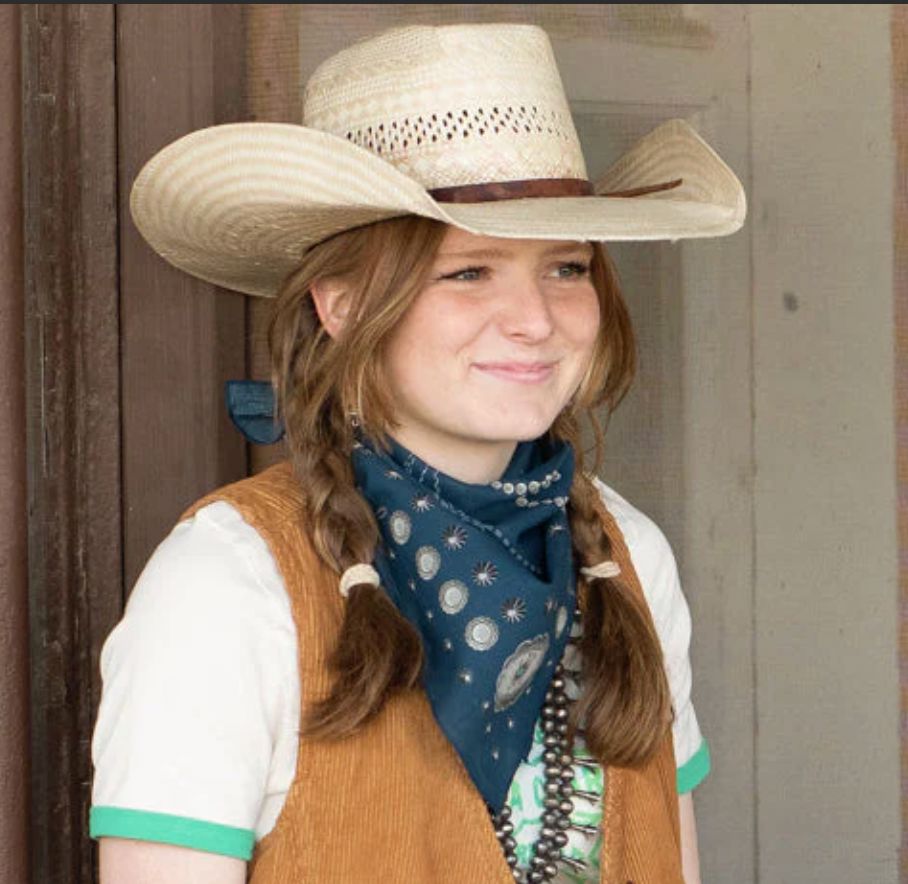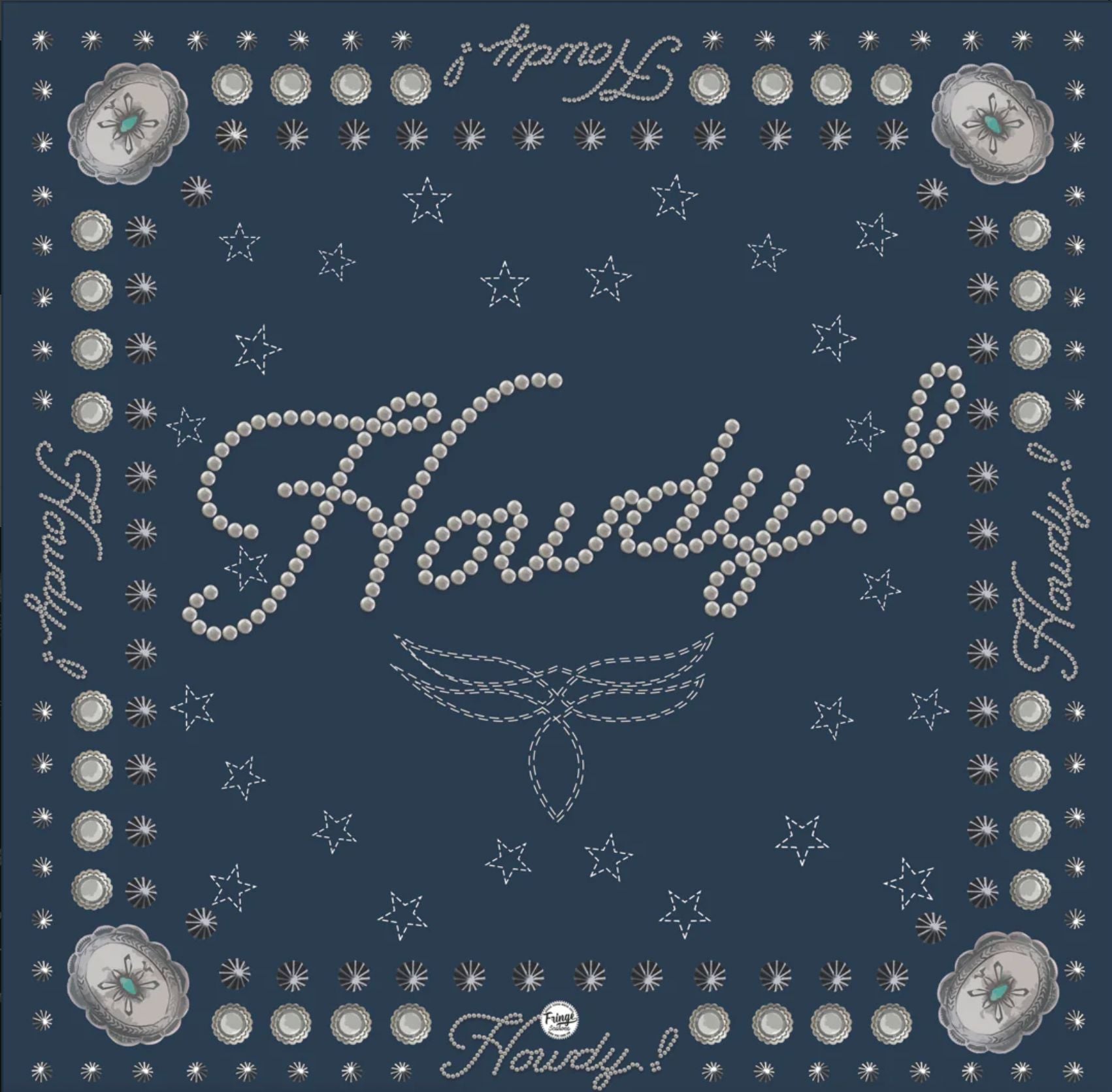 100% cotton "Howdy" Bandana is a chip off the old block! An original concept, creating classic Western wild rags using our vintage collection of early silver conchos and jewelry. Now offering this same look in a fun 100% cotton bandana line.