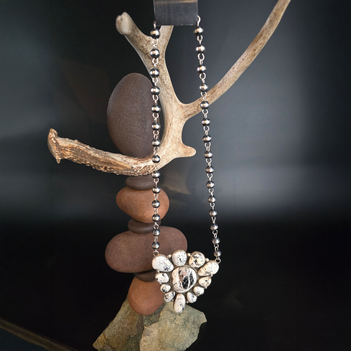 This exquisite White Buffalo cluster necklace is a true statement piece, crafted with 12 natural White Buffalo stones set in sterling silver and finished with a rosary-style bead chain. Each stone features its own unique matrix, creating a one-of-a-kind collectible heirloom.