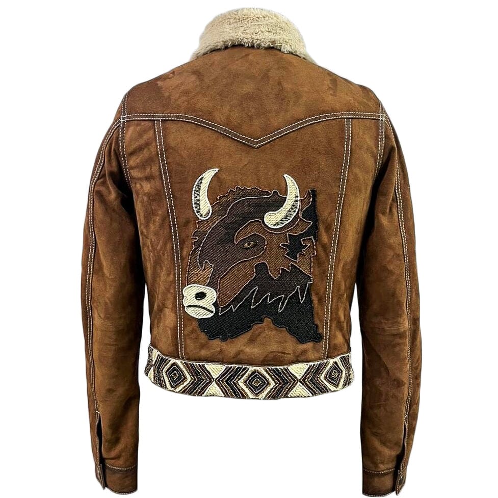 Make a bold statement with the Bison Beaded Leather Jean Jacket, crafted from premium goat suede leather. This piece reimagines classic jean jacket styling with a distinctive Western flair. Its standout feature is the intricately beaded bison artwork on the back, paired with Aztec-inspired beadwork along the hemline for a truly eye-catching design.