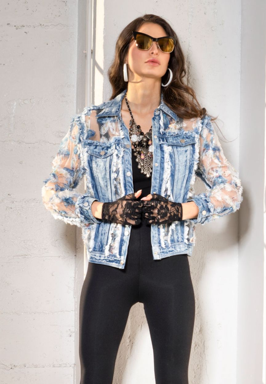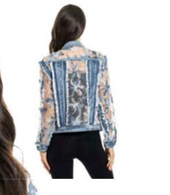 Blue denim panels featuring embroidered white lace insets. Perfect summer fun piece!