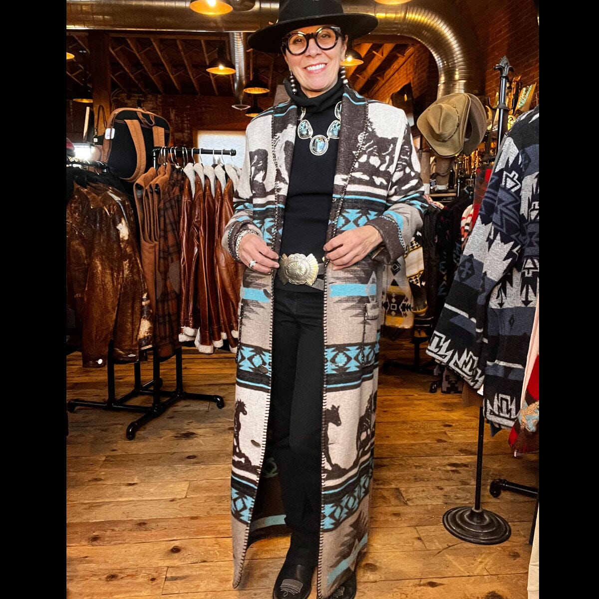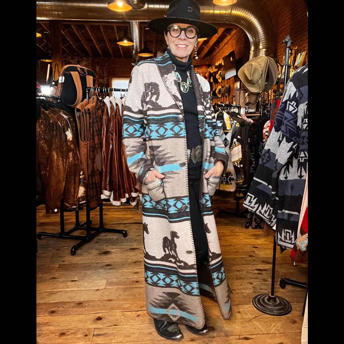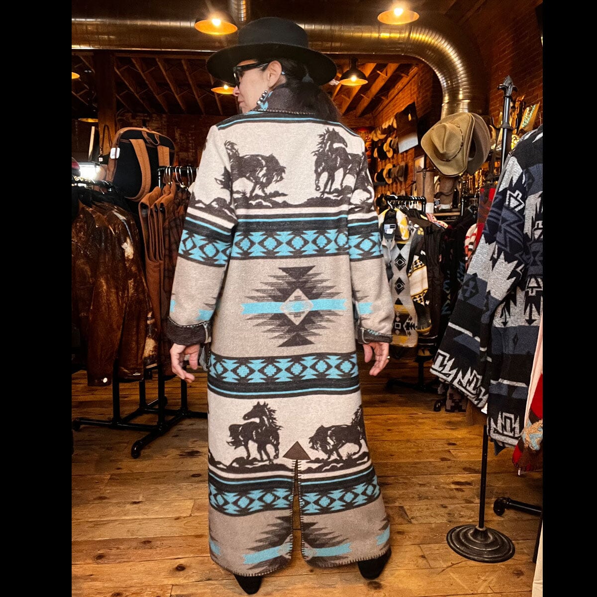 DUSTER is a wool blend fabric in a generous fit unlined long Duster (52" center back finished length) with a kick vent. Shawl collar, 4 large concho buttons, turn back sleeve, patch pockets & blanket-stitch finish. Available in ANY available fabric.