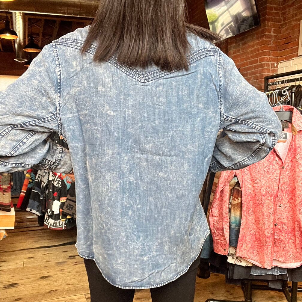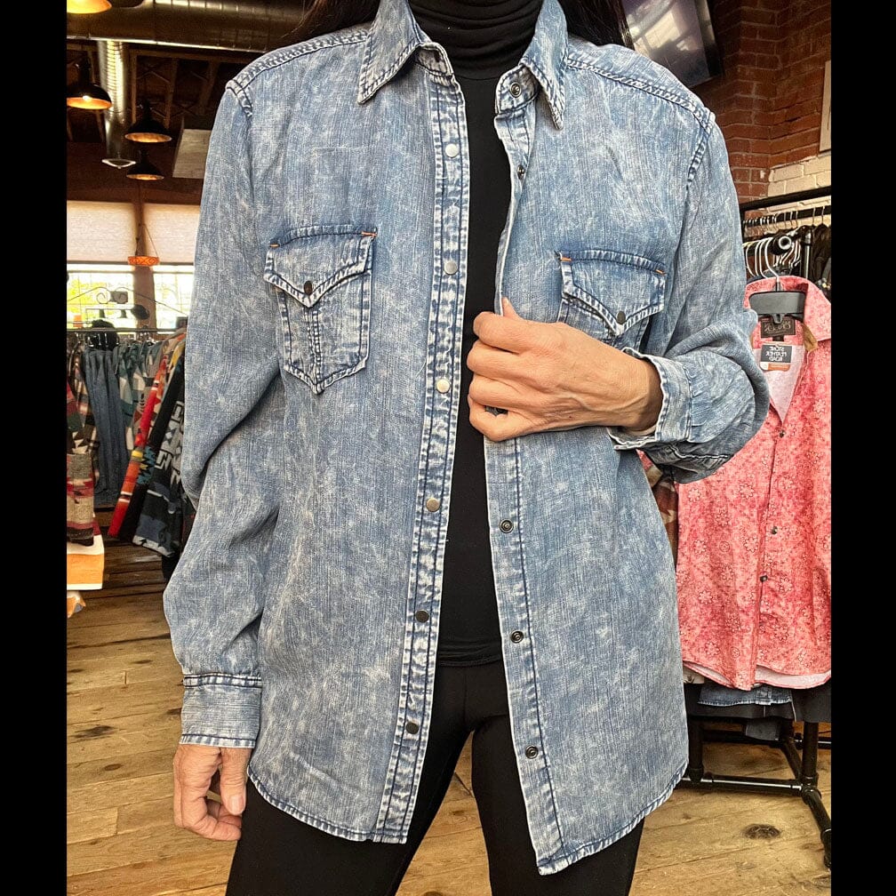 This stylish denim shirt is 100% tencel. It features a snap front and cuff closures, point collar and two chest flap pockets with a center pleat and snap closures. Machine wash in cold water with like colors and tumble dry low and promptly remove.