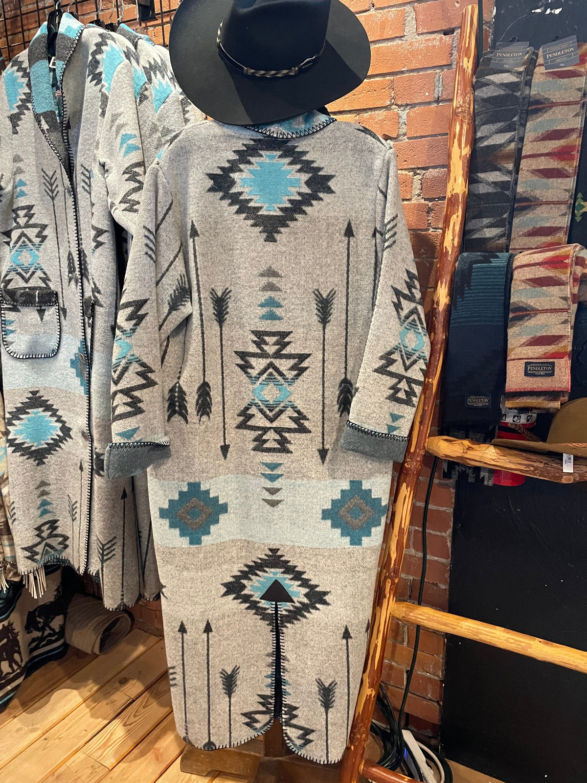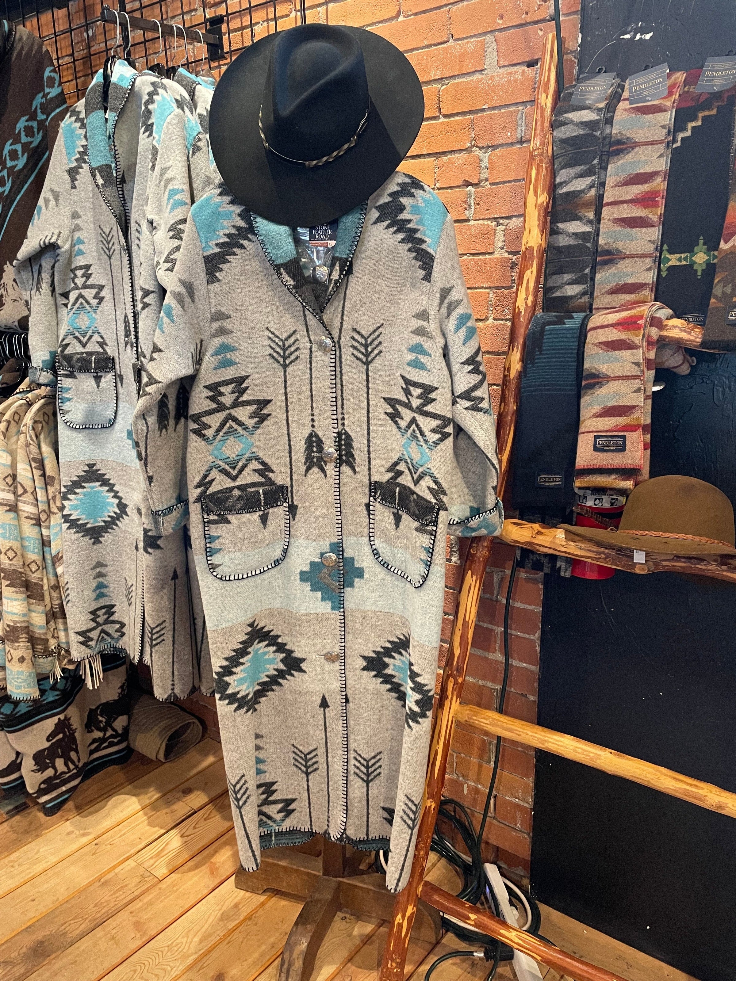DUSTER is a wool blend fabric in a generous fit unlined long Duster (52" center back finished length) with a kick vent. Shawl collar, 4 large concho buttons, turn back sleeve, patch pockets & blanket-stitch finish.