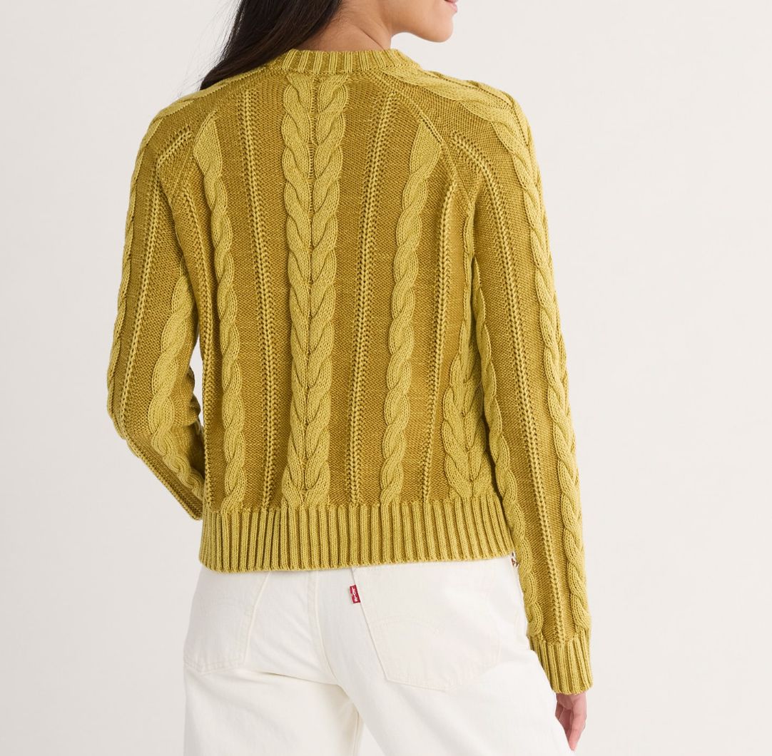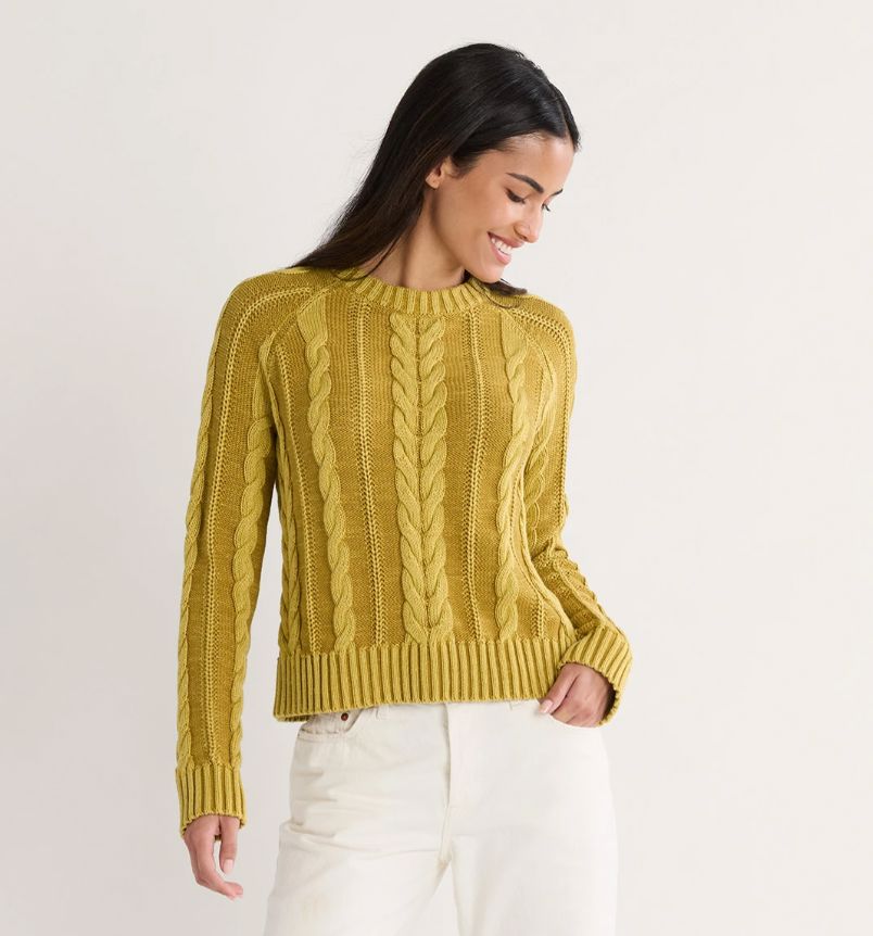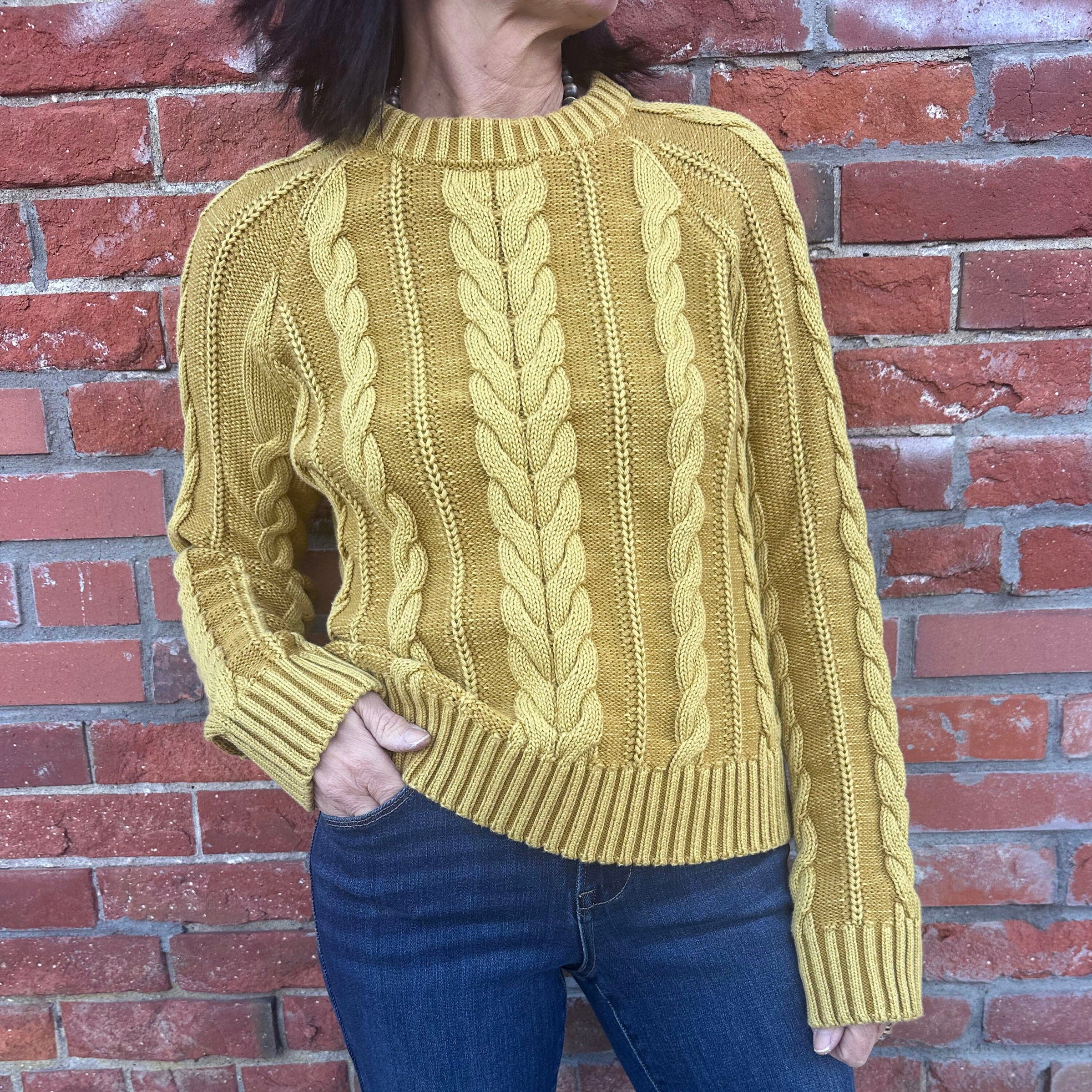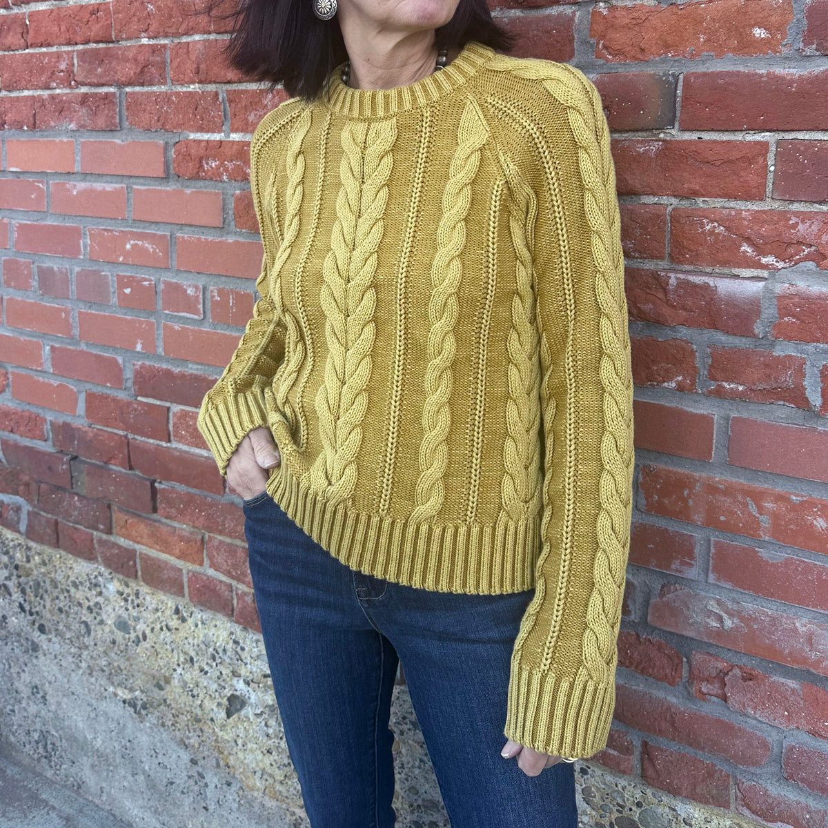 Two slightly contrasting yarns are plaited together to create a depth of color in this sweater, giving it a unique, sun-bleached look. All-over cabling, raglan sleeves, and a slightly relaxed neck.