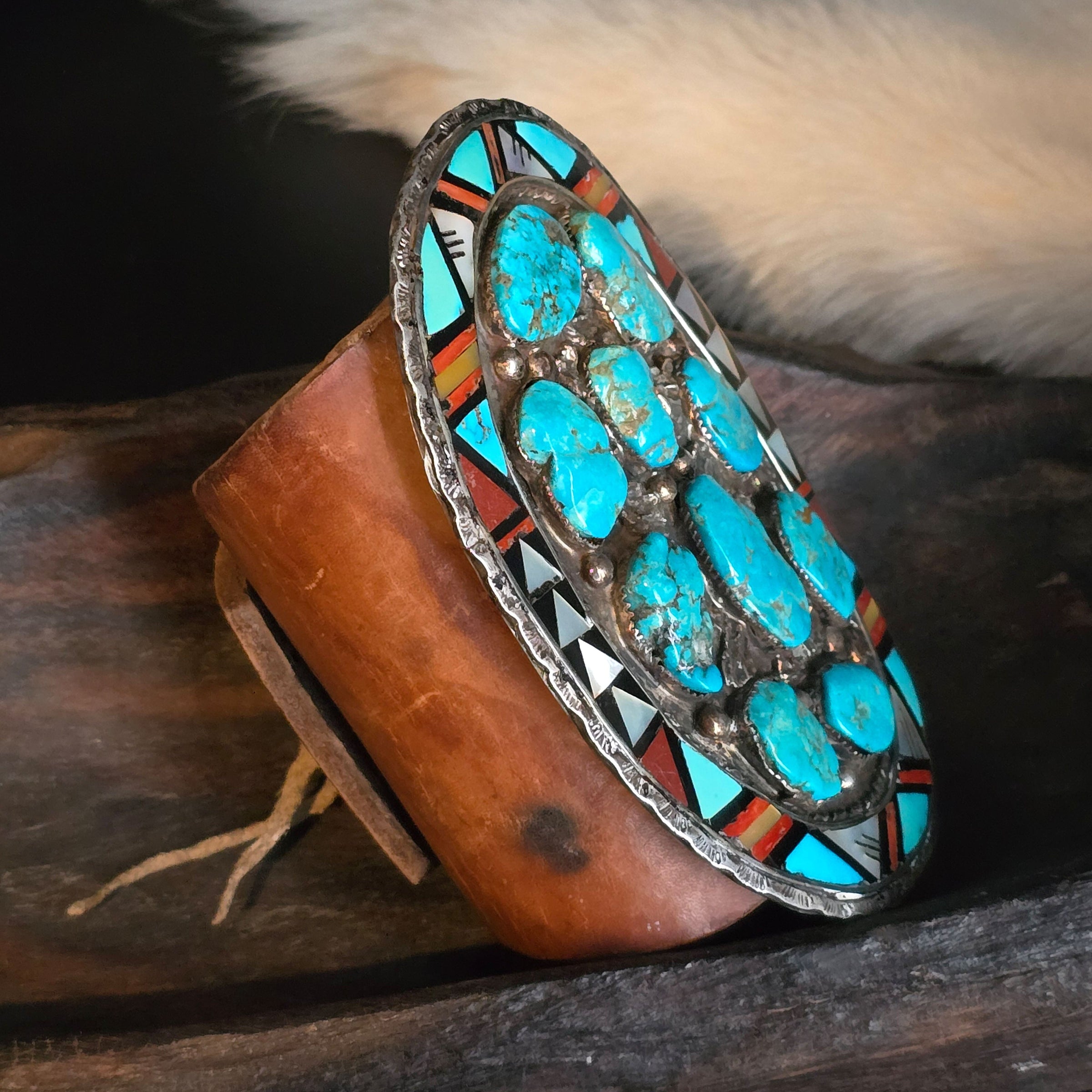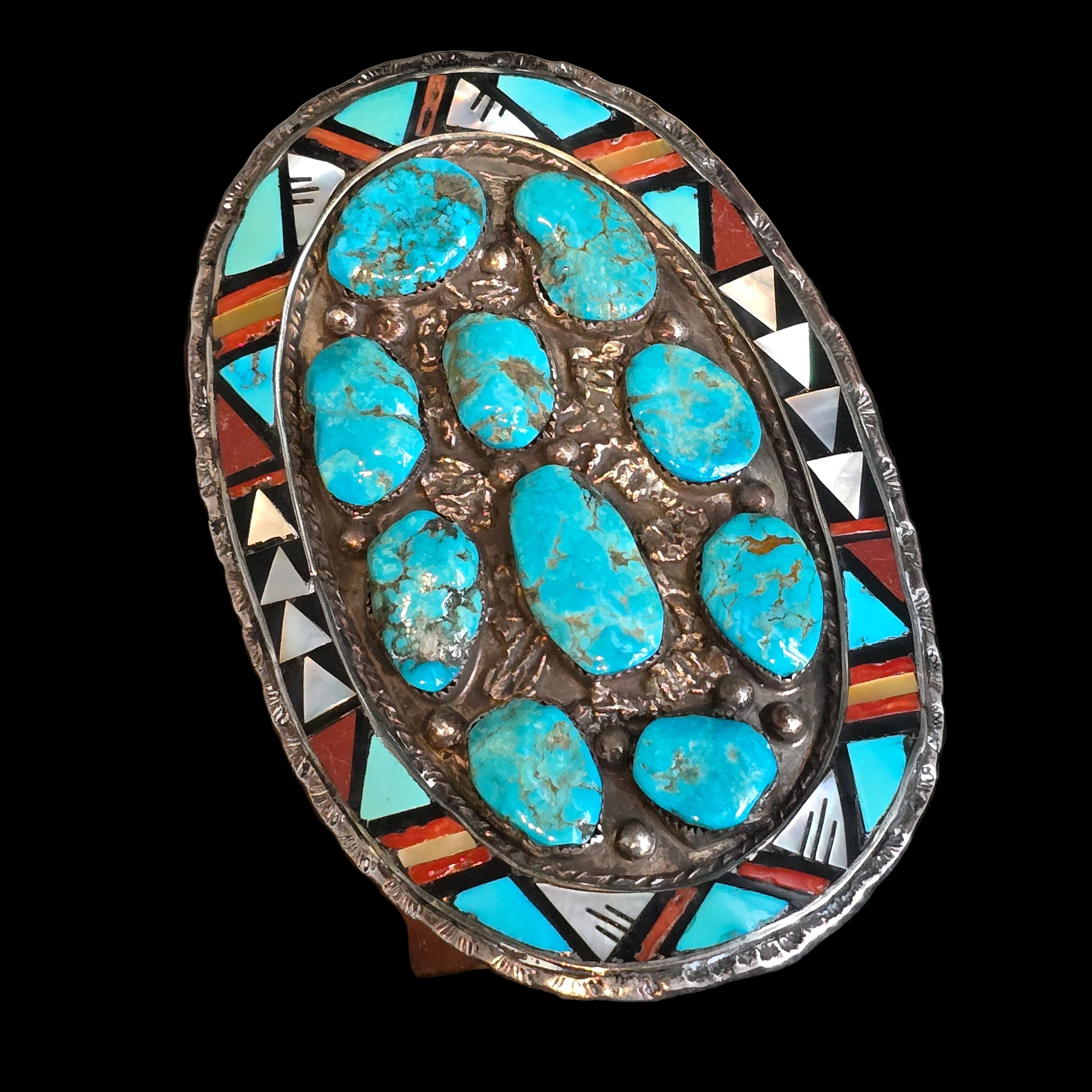 A stunning statement of craftsmanship and Western soul. Hand-inlaid turquoise stones shimmer in a smooth sterling silver cuff, creating a one-of-a-kind work of art. The oval centerpiece adds bold elegance while the adjustable band ensures a comfortable fit.