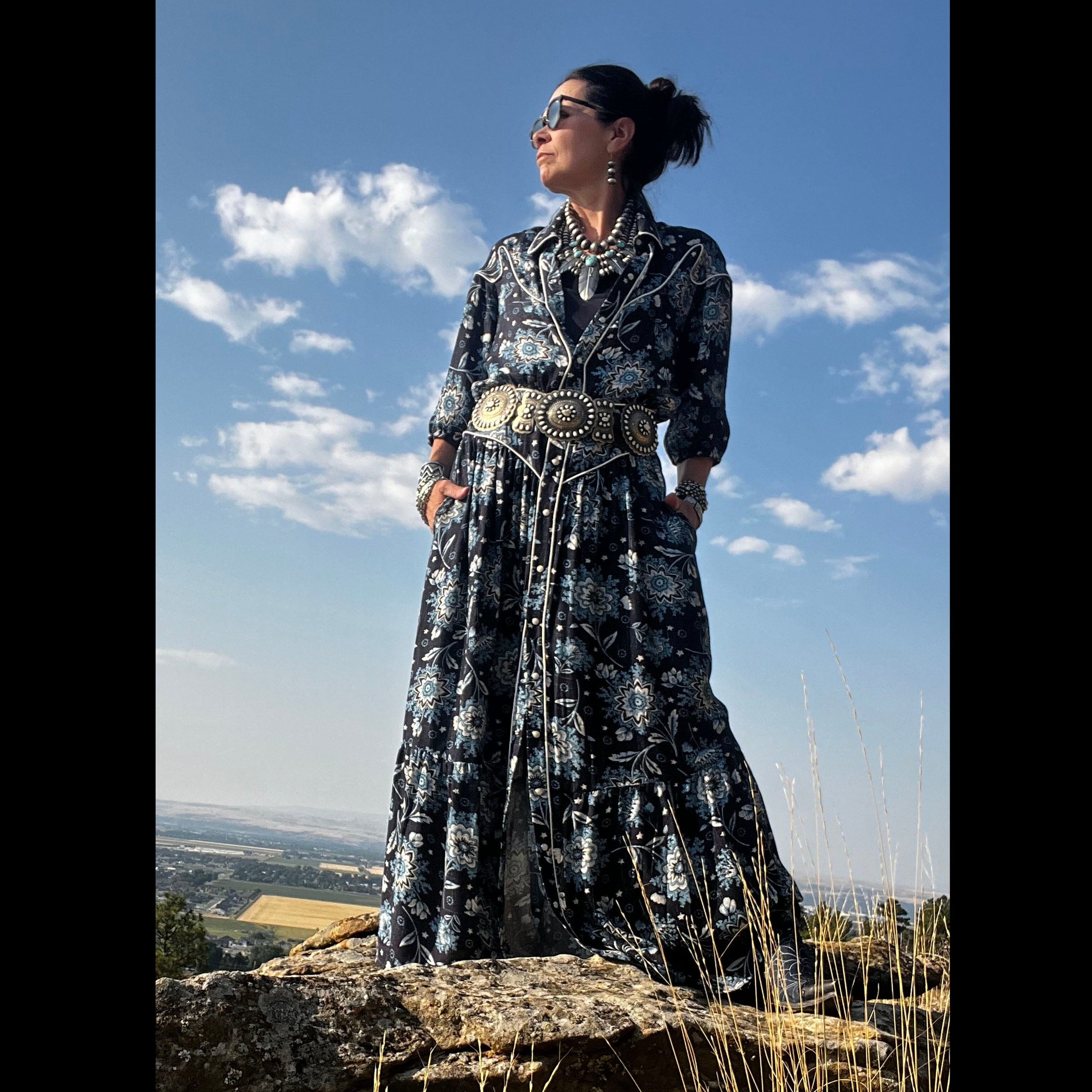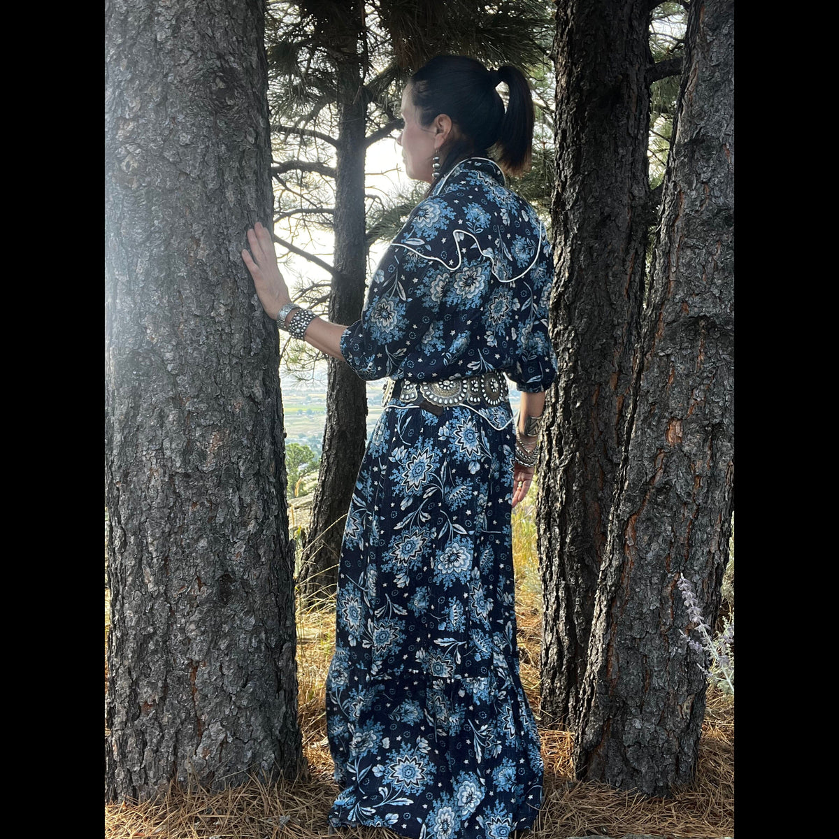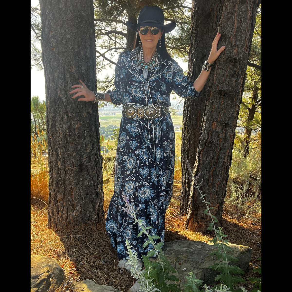 This isn’t your average bandana print! This stunning indigo-and-cream iteration was inspired by an old bandana of Chisholm Trail’s namesake, Jesse Chisholm. The ornate florals are accented by sweet star details, and this beautiful button-down maxi dress is finished with classic contrast piping and a full front placket of pearl snaps.
