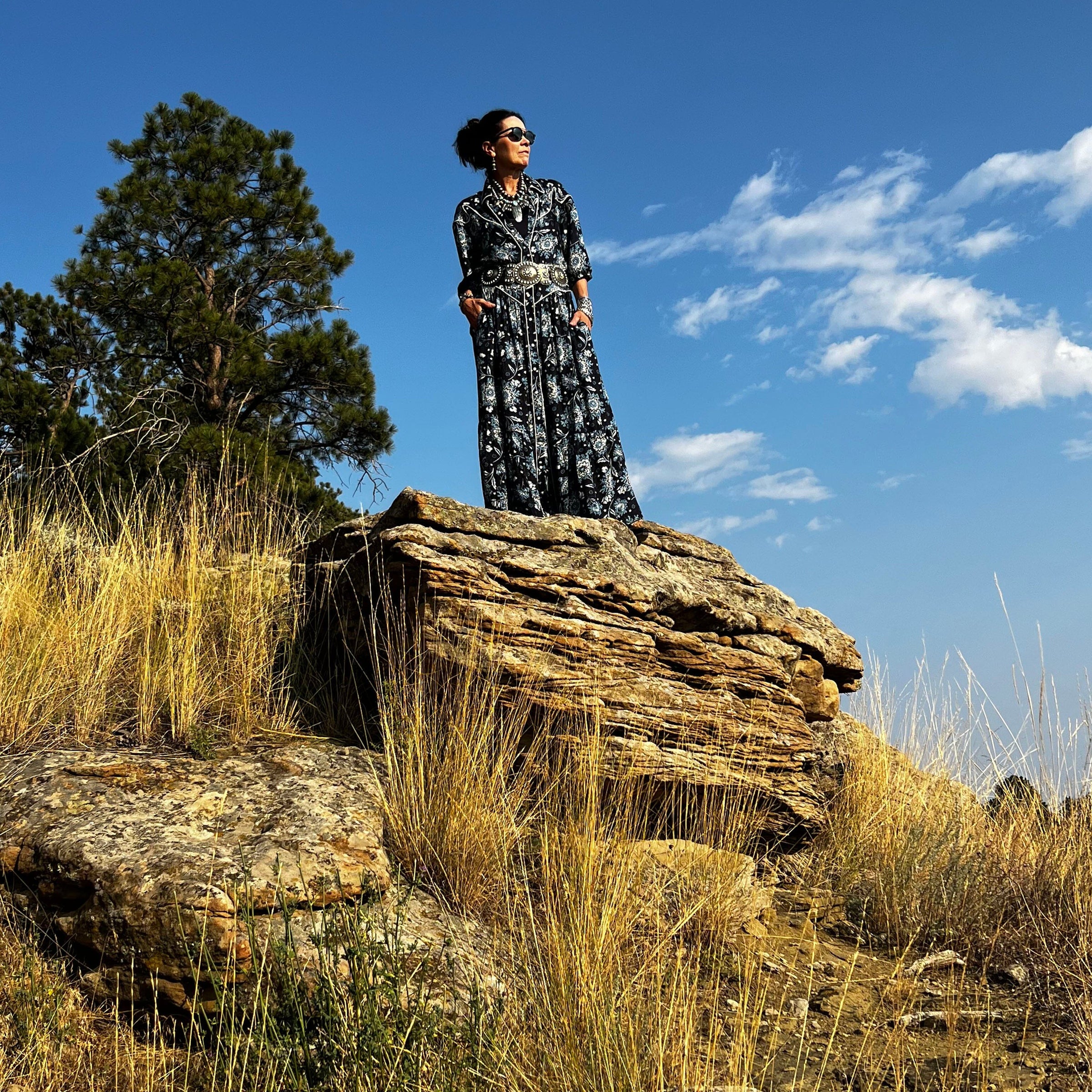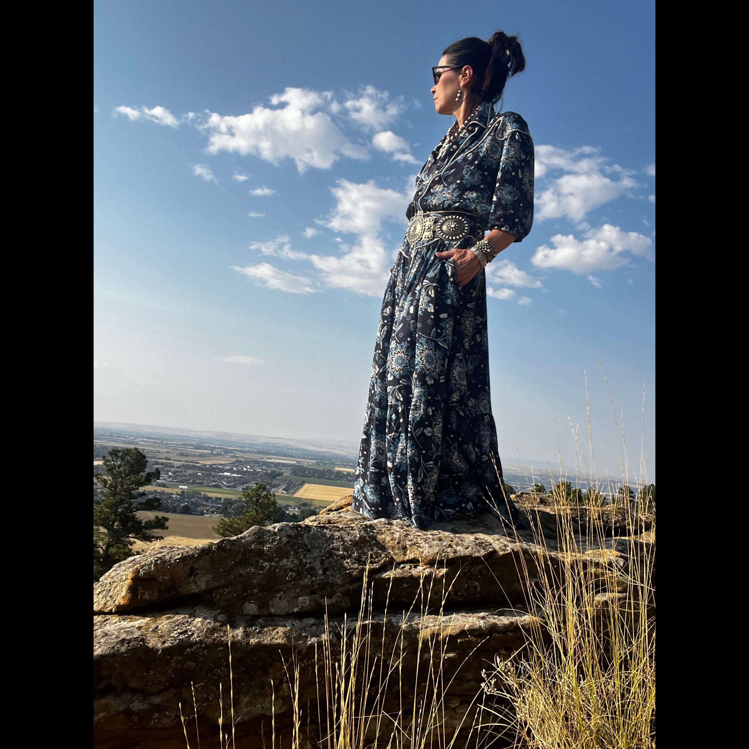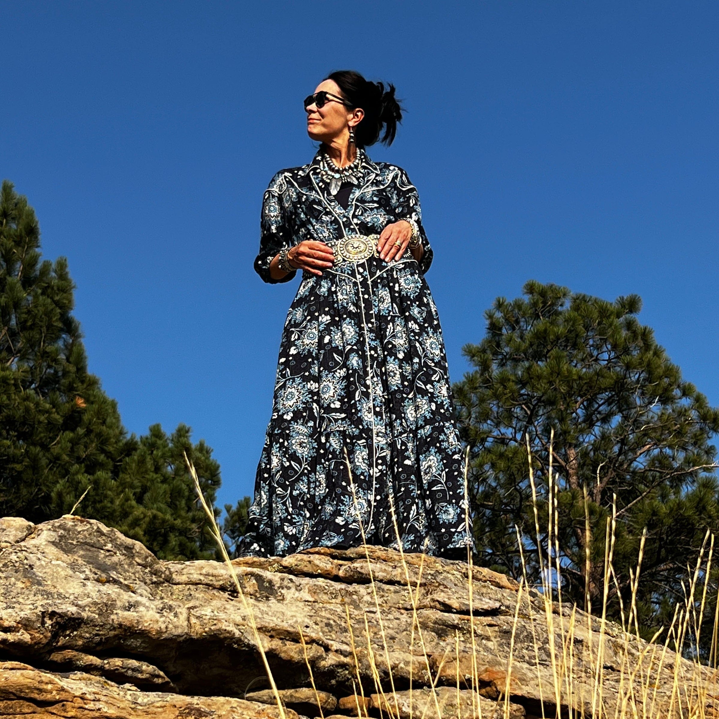 This isn’t your average bandana print! This stunning indigo-and-cream iteration was inspired by an old bandana of Chisholm Trail’s namesake, Jesse Chisholm. The ornate florals are accented by sweet star details, and this beautiful button-down maxi dress is finished with classic contrast piping and a full front placket of pearl snaps.