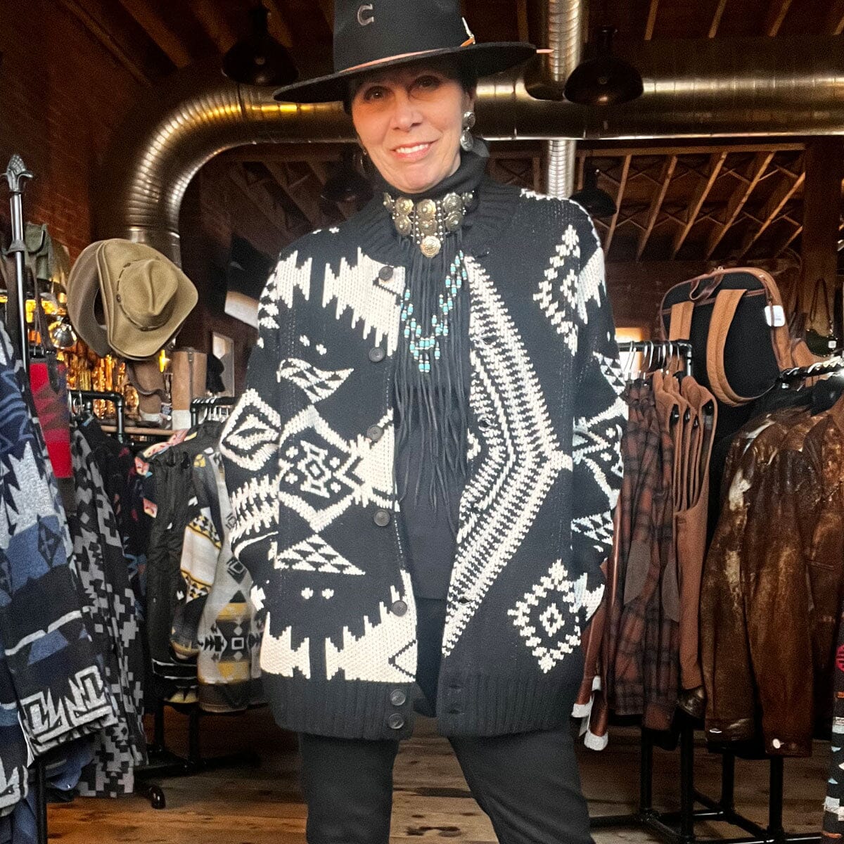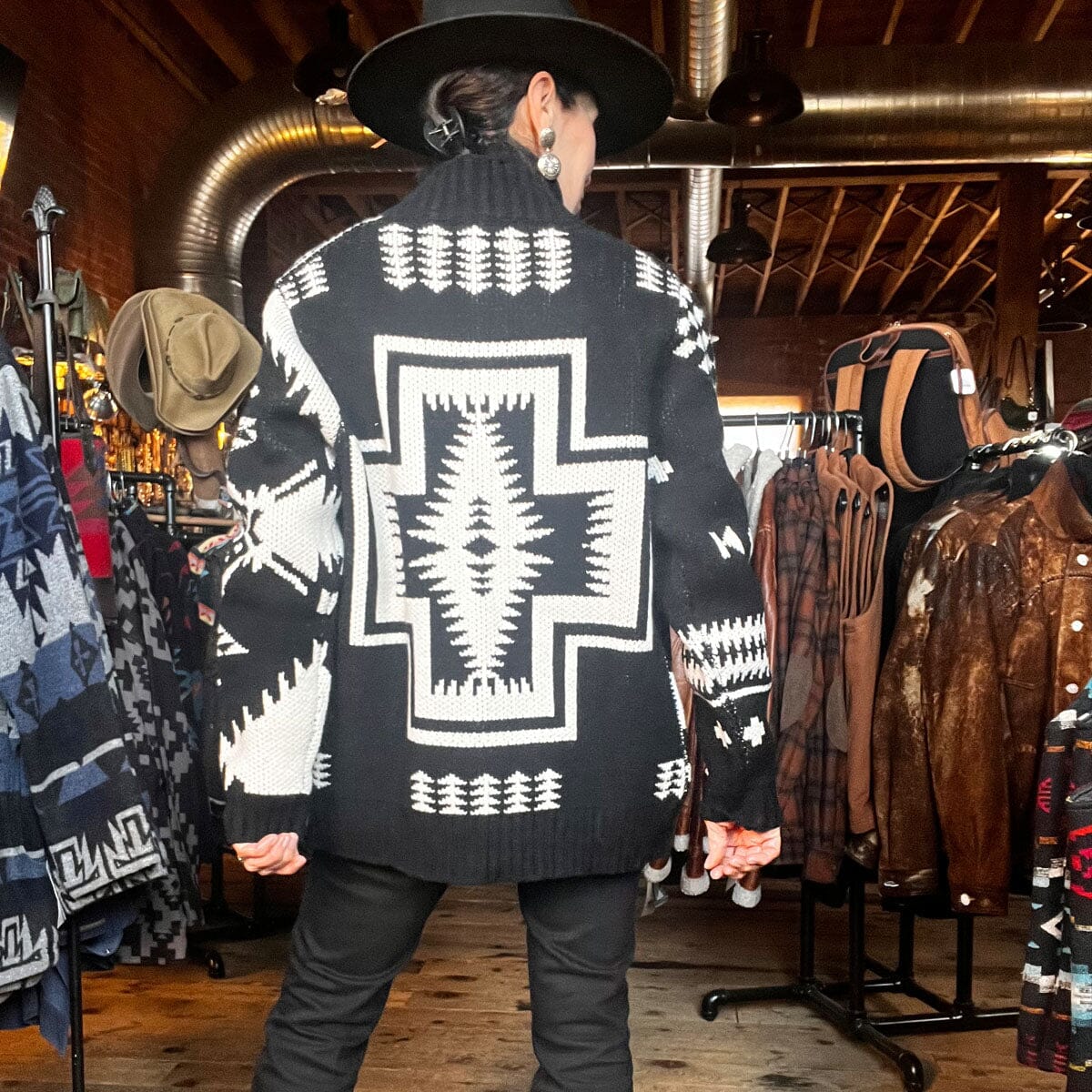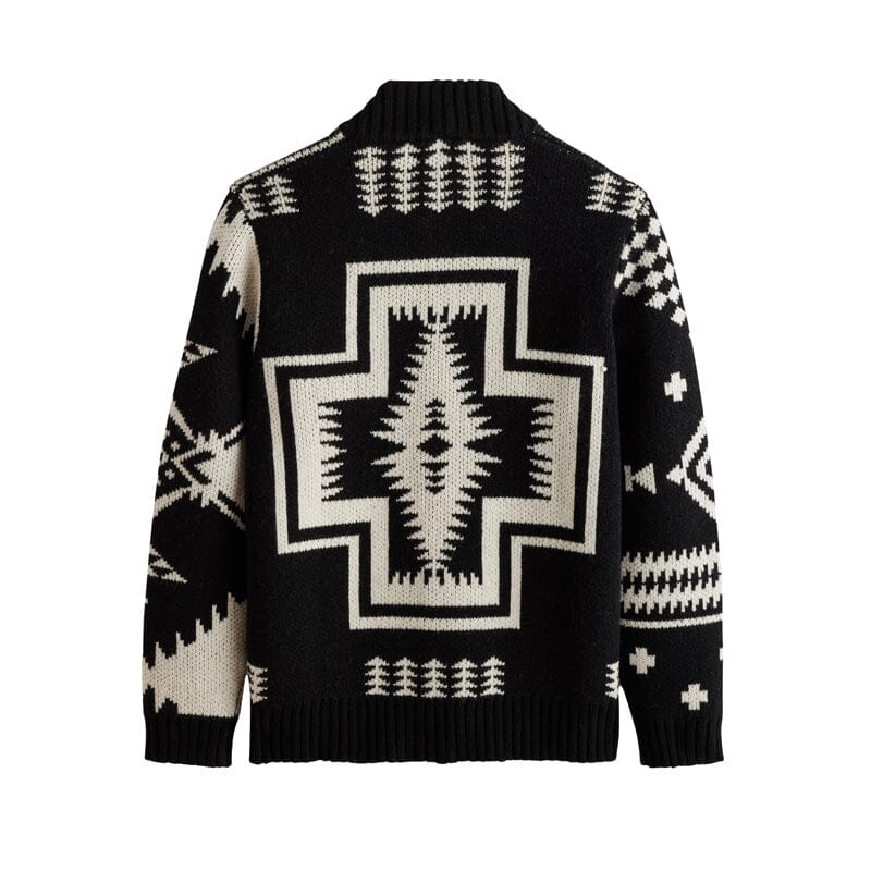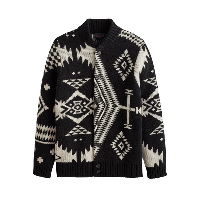 This luxurious lambswool men's cardigan combines a trio of Pendleton patterns drawn from our iconic blankets. Button front, ribbed baseball-style collar and ribbing at the cuffs, hem and pockets.