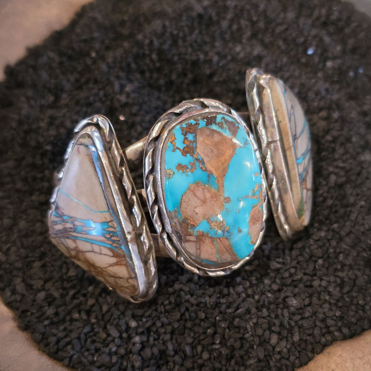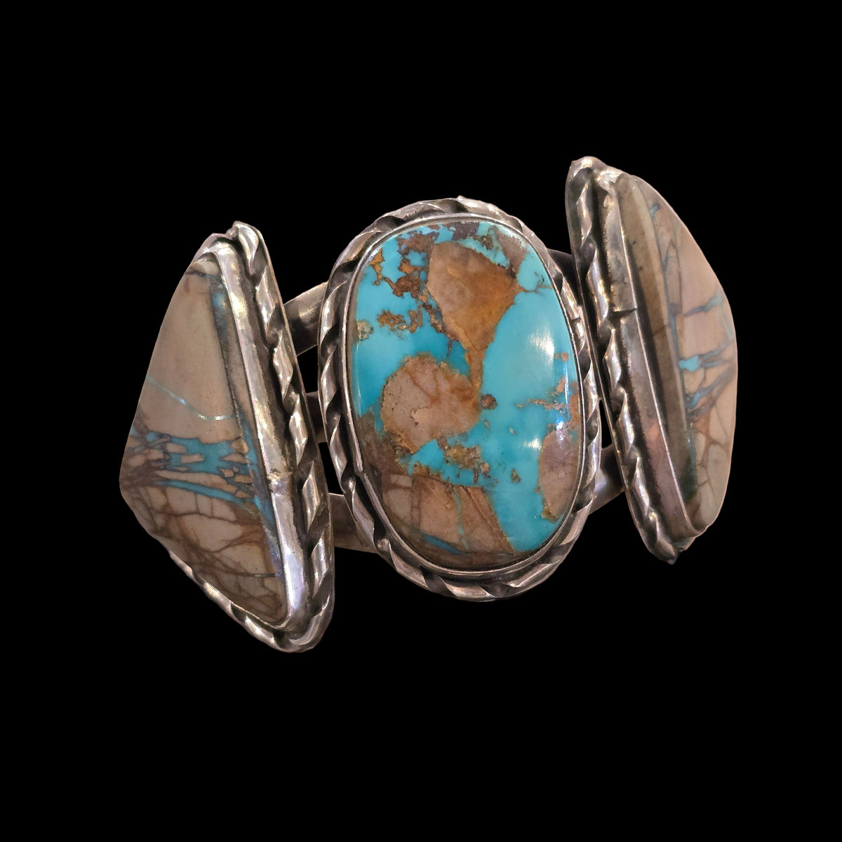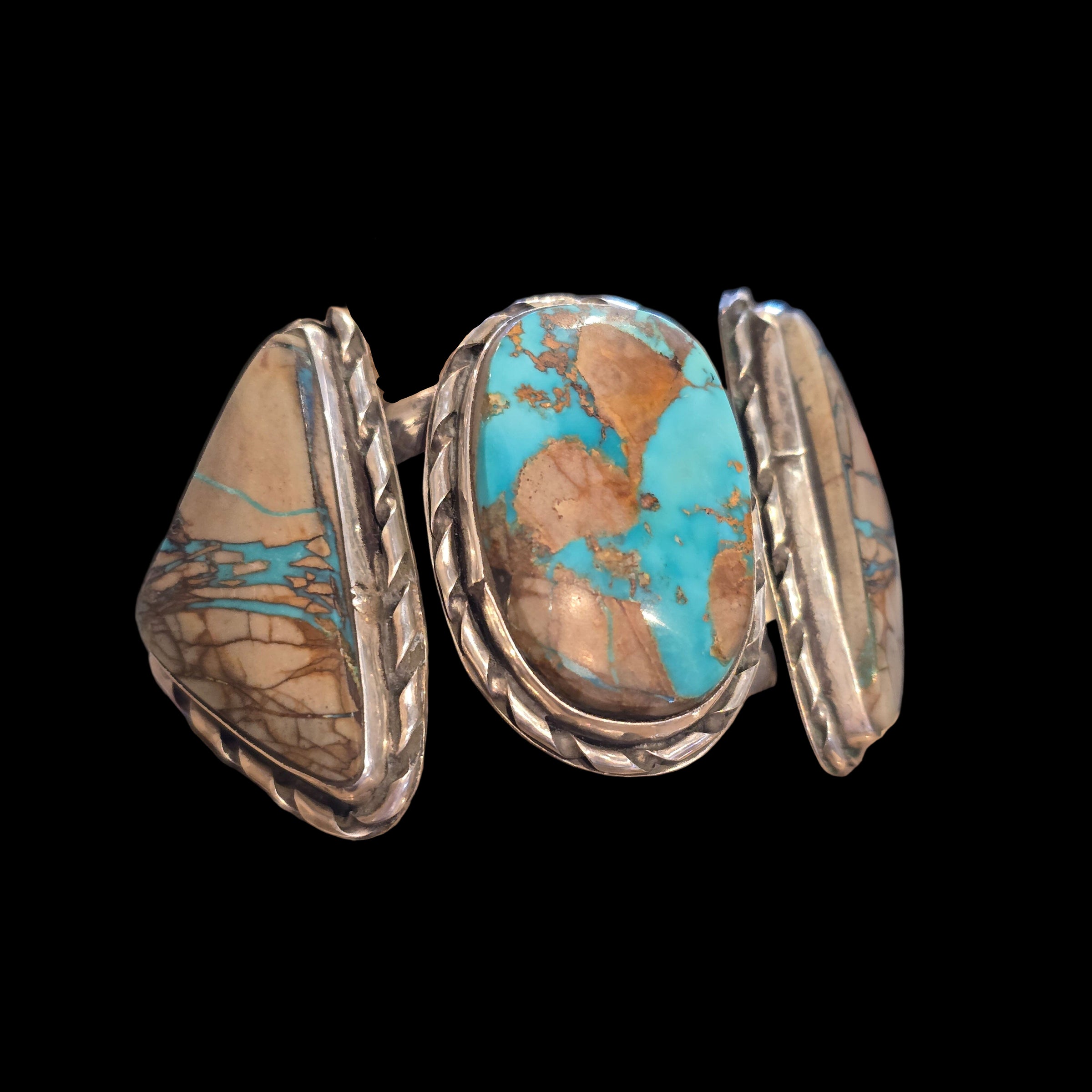 This extraordinary cuff features a striking arrangement of Royston Ribbon Boulder Turquoise — a rare and highly collected turquoise known for its vibrant blue veining running naturally through warm, earthy matrix stone. The center stone is beautifully cut in an oval shape, flanked on each side by triangular companion stones, creating a bold, balanced, and sculptural silhouette across the wrist.