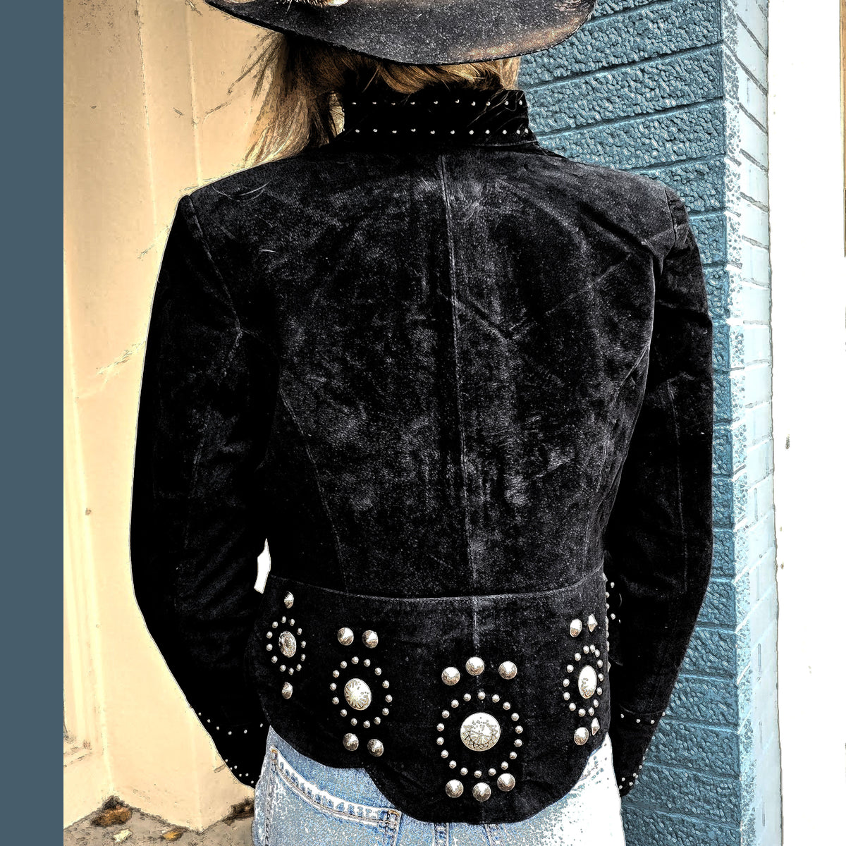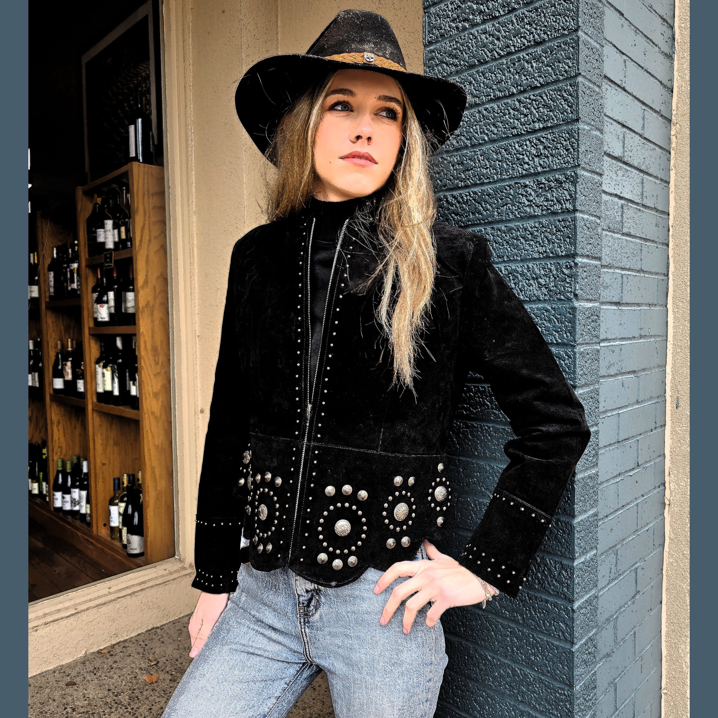 Suede concho jacket. You'll be styling in this fashion forward boar suede concho jacket. It features a zip front closure with intricate concho and stud design that fits into the curved scalloped bottom hem. Stud detailing on cuffs, band collar and front zipper. Fully lined.
