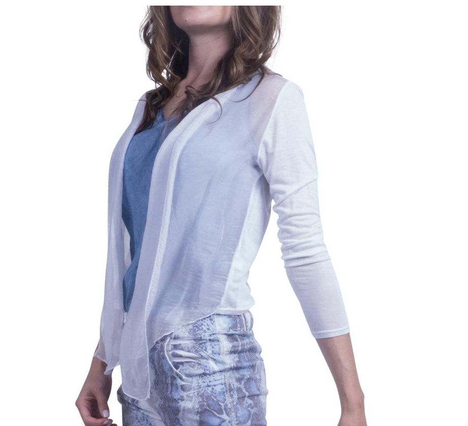 Beautiful jacket with full silk front panels and a soft viscose knit panel on the back and on the sleeves.