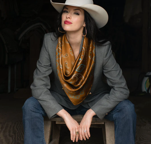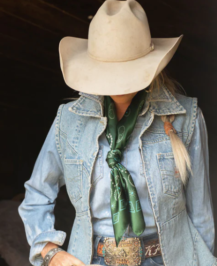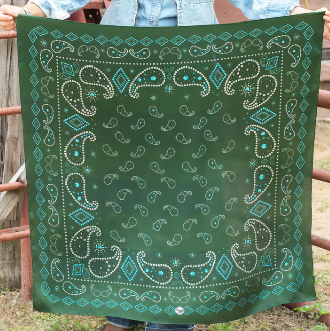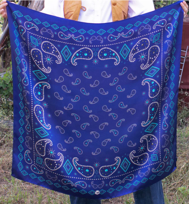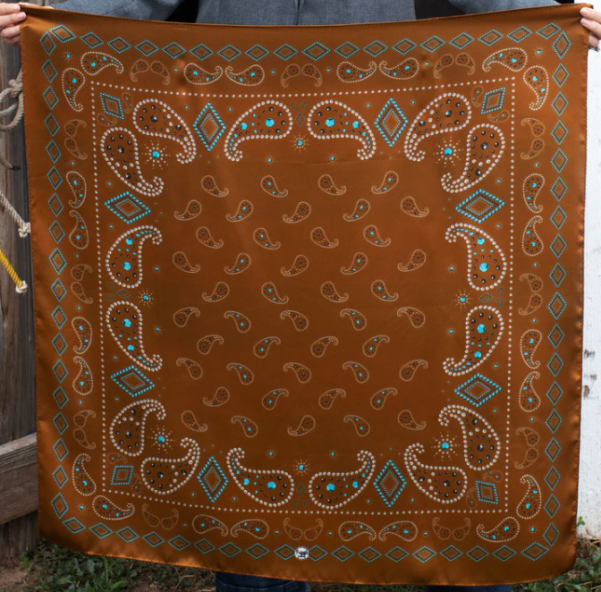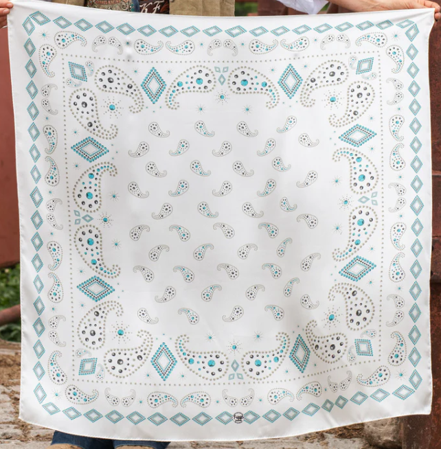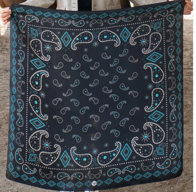 The Pretty Paisley is a mix of turquoise and silver studs that make up this paisley and aztec patterned wild rag. A classic look that will work as a timeless addition to your wardrobe.