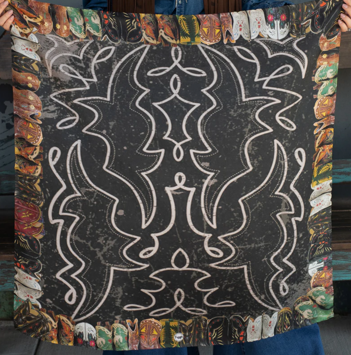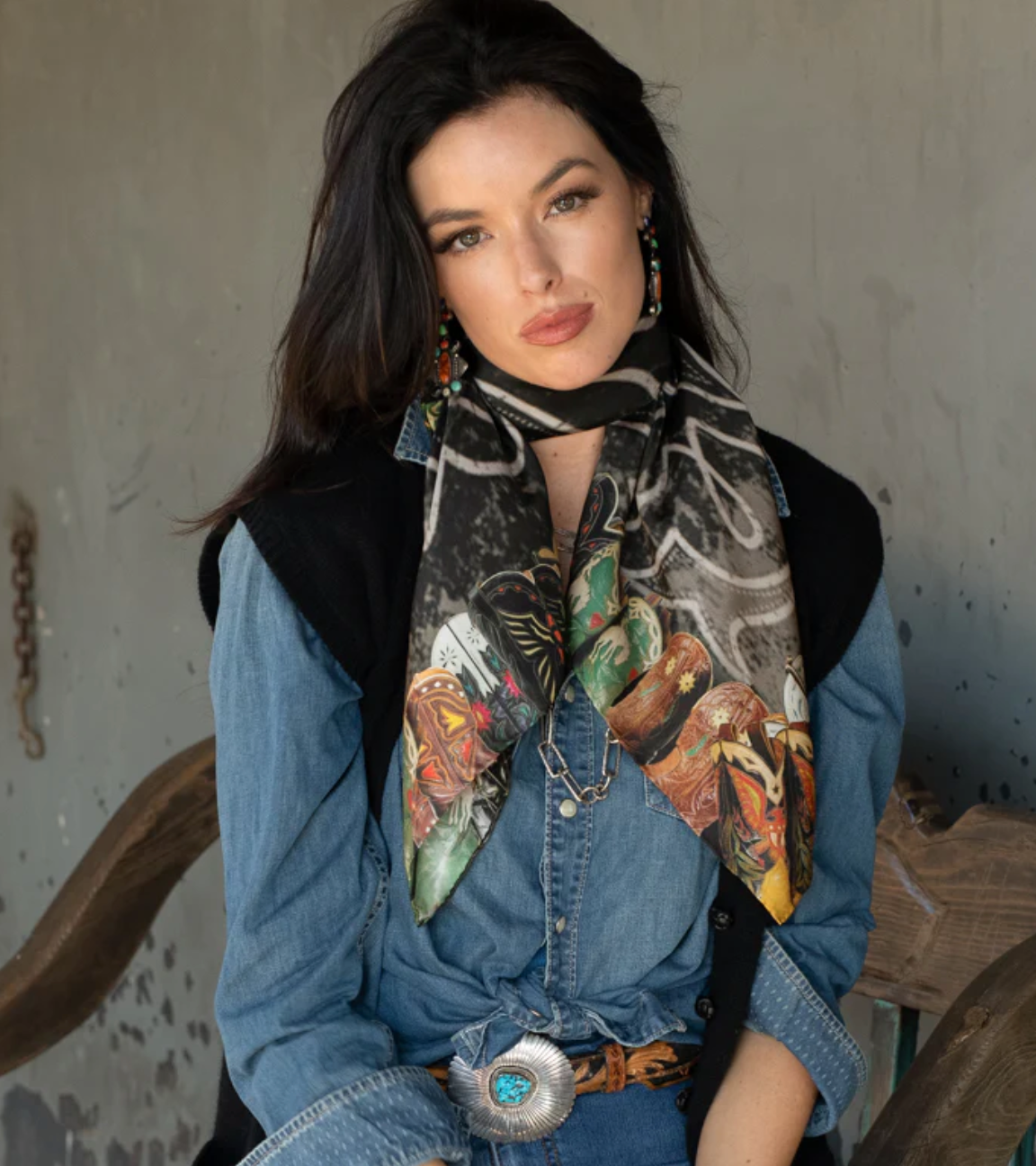The Tops comes in both our Long-Tall and our Shorty sizes and is 100% Satin Silk. Boot stitching in the center with an array of vintage boot tops at the edge. This great black scarf is a great way to top off any outfit.